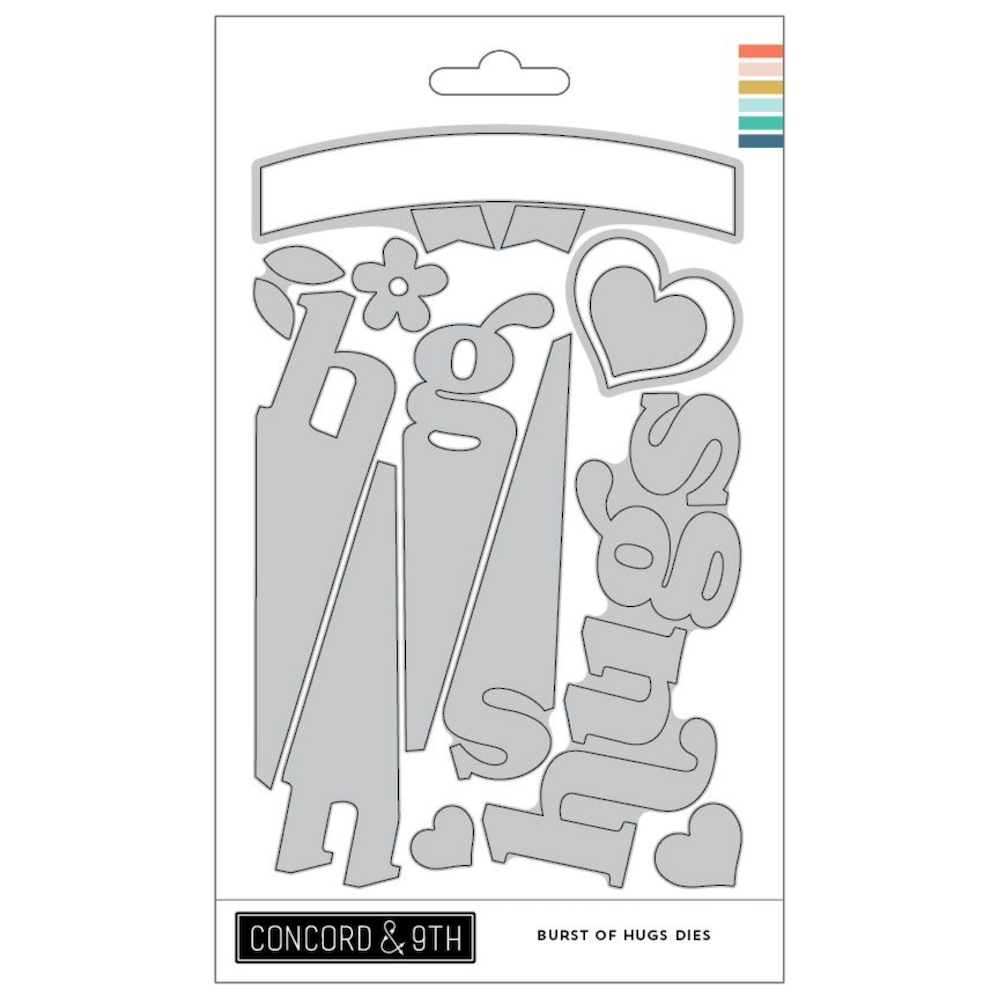 The Concord & 9th Burst of Hugs Stamp and Die Bundle is perfect for creating heartfelt, encouraging cards. The 4 x 4 inch Burst of Hugs Clear Stamp Set features 9 pieces, including 5 curved sentiments like,