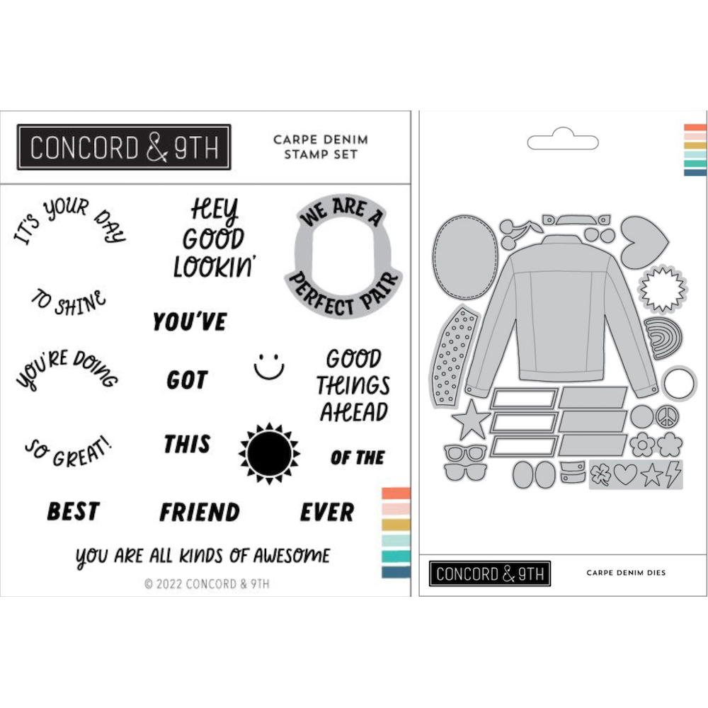 Introducing the Concord & 9th Carpe Denim Stamp and Die Bundle! Elevate your crafting with this versatile duo. The Clear Stamp Set features 15 fun sentiments and designs, perfect for personalizing your projects. Sentiments include,