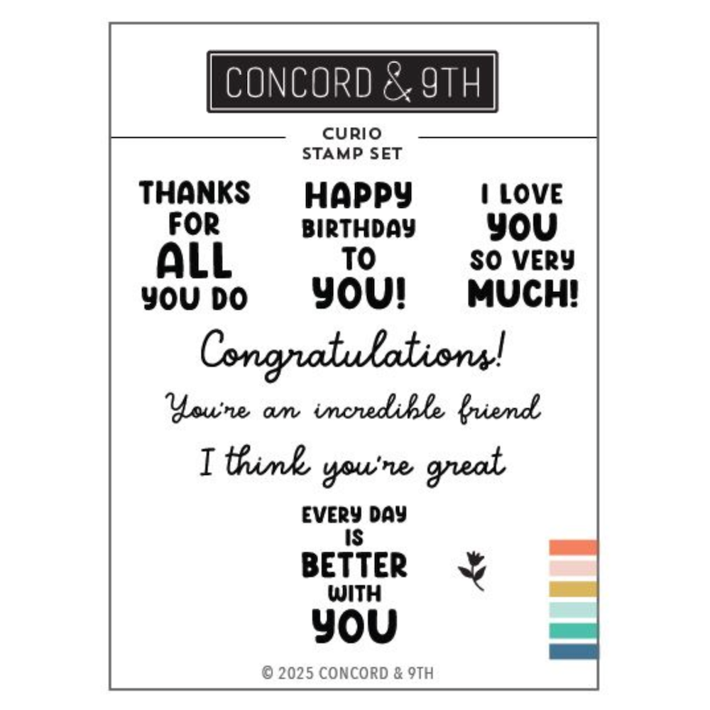 The Concord & 9th Curio Stamp and Die Bundle includes a 3 x 4 inch clear stamp set with a mix of bold and script sentiments that include: