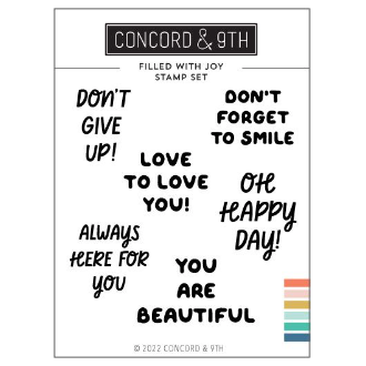 The Concord & 9th Filled with Joy Clear Stamp Set contains six uplifting sentiments, including "Don't give up" and "Oh happy day," in a compact 3 x 4-inch size. It coordinates seamlessly with the Filled with Joy Stencil Pack.