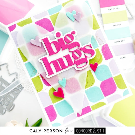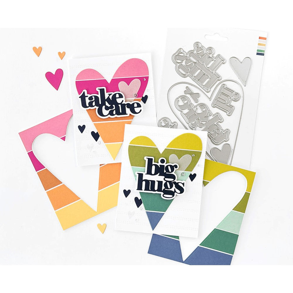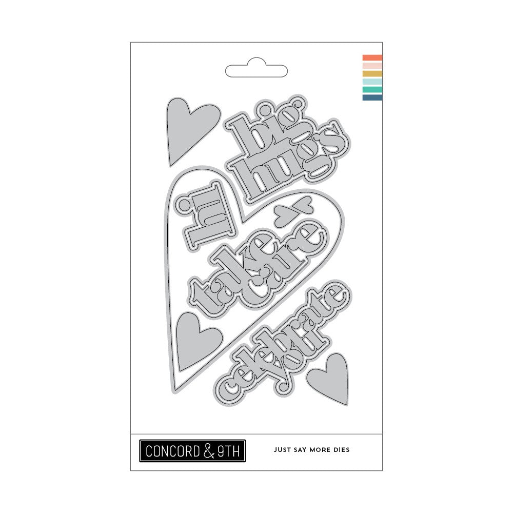The Concord & 9th Just Say More Dies is a versatile 8.75 x 5.25 wafer-thin die set that includes 13 pieces. The set includes four friendly greetings - "Hi," "Big hugs," "Take Care," and "Celebrate You" - as well as several different-sized hearts.