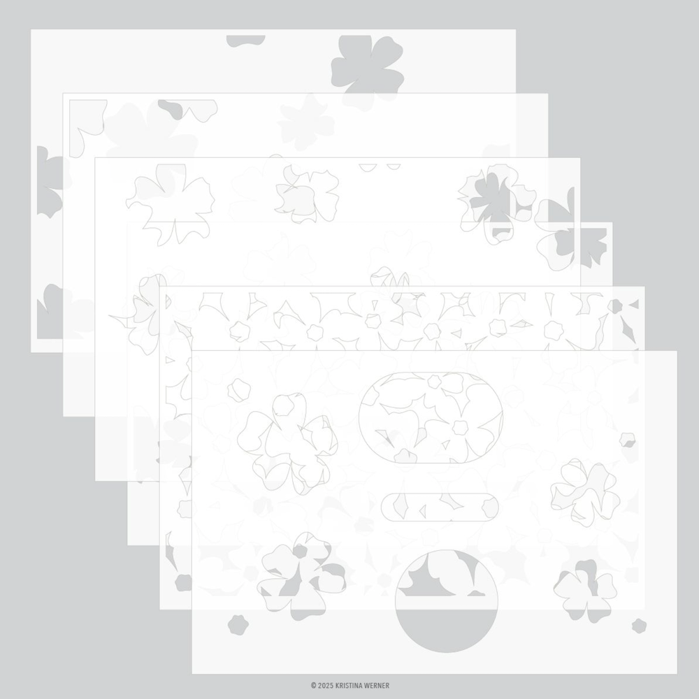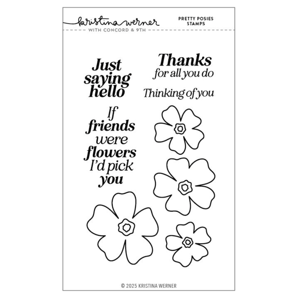 The Concord & 9th Kristina Werner Pretty Posies Stamps, Stencil, and Die Bundle is a beautifully coordinated set for creating charming floral designs. The Pretty Posies Background Stamp (6 x 6 inches) features Kristina Werner’s signature hand-drawn floral style, perfect for adding a delicate touch to cards and tags. The Pretty Posies Clear Stamp Set (4 x 6 inches) includes 8 pieces, allowing you to create a lovely bouquet with four heartfelt sentiments. Sentiments include,