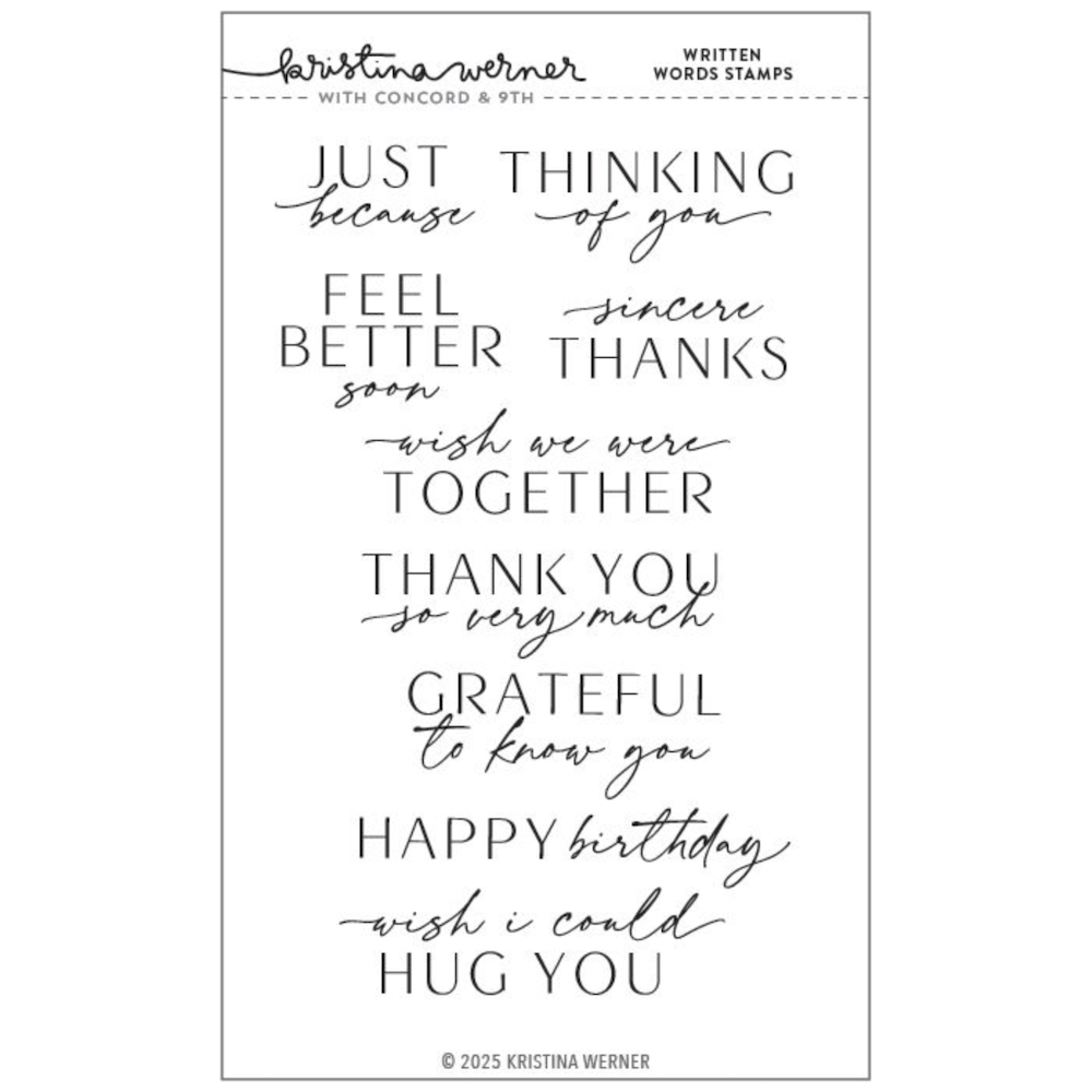 Add a touch of handwritten flair to your cards with the Concord & 9th Kristina Werner Written Words Clear Stamp Set. This 4 x 6 inch 9-piece set features beautifully scripted sentiments perfect for any occasion. Pair it with the coordinating Written Words Dies for added dimension and creativity. Sentiments include,