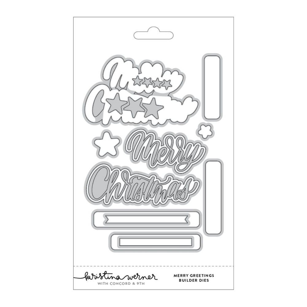 The Concord & 9th Merry Greetings Builder Die Set includes 15 pieces, designed to coordinate with the stamp set. It features individual "Merry" and "Christmas" word dies that can be used alone or paired with matching shadow dies for a layered, dimensional look. This die set adds a polished, custom touch to your cards, offering endless possibilities for creative holiday projects.