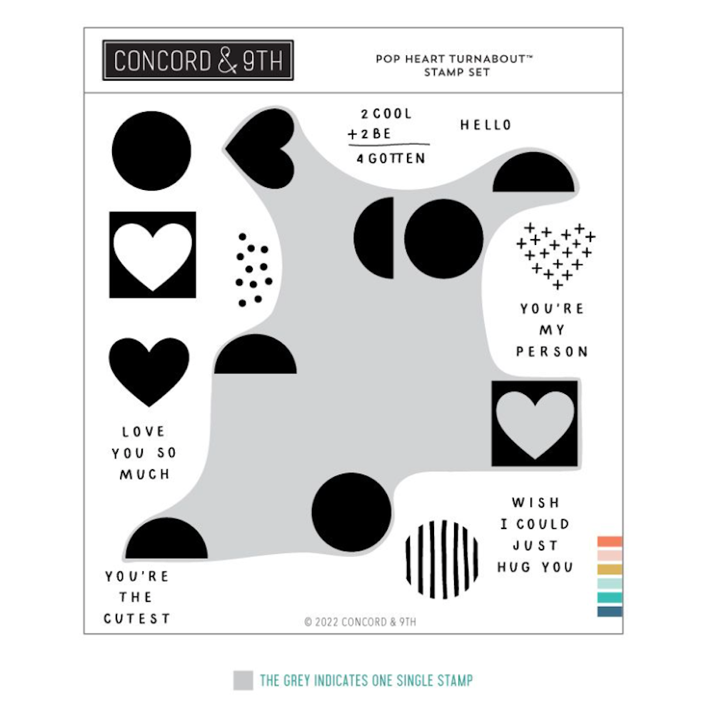 Elevate your card designs to a pop art level with the Concord & 9th Pop Heart Turnabout™ Stamp Set. With just four turns of the cardstock, you'll create a striking background for sentiments and embellishments. This 6 x 6 inch stamp set includes 12 pieces for endless creative possibilities.