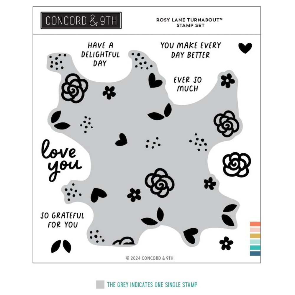 The Concord & 9th Rosy Lane Turnabout Stamp Set is a 6 x 6 inch set with 10 pieces, including 5 sentiments. Sentiments include,