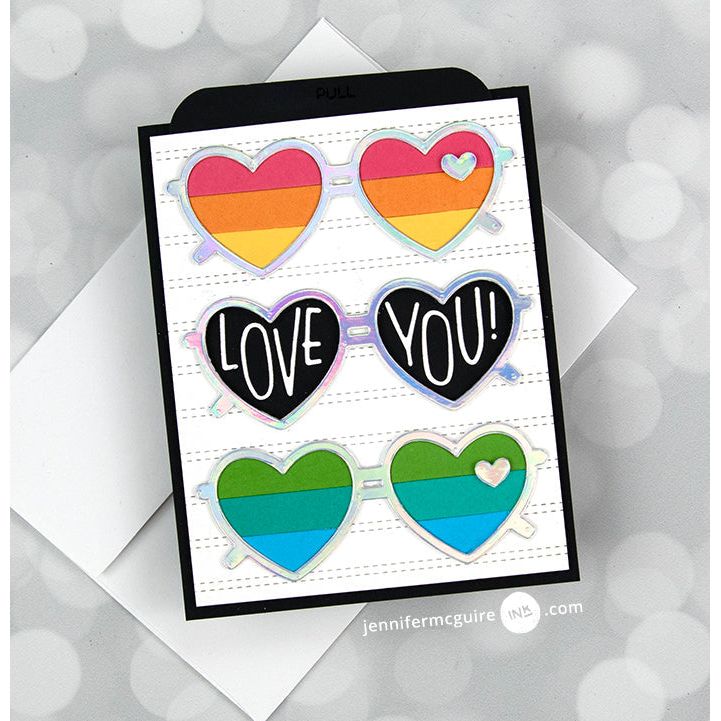 Thank you for providing the updated information. The Concord & 9th Spectacular Shades Dies is a wafer-thin die set that contains 16 pieces. The set includes four different sunglasses in various shapes and styles, each with a unique design inside the lenses. One of the sunglasses is heart-shaped and features the phrase "Love You," another one says "Stay Cool," and the remaining two have striped patterns. Additionally, the die set includes hearts and diamonds to complement your projects. These dies coordinate with the Spectacular Shades Stamps 11840 for added versatility in your crafting.
