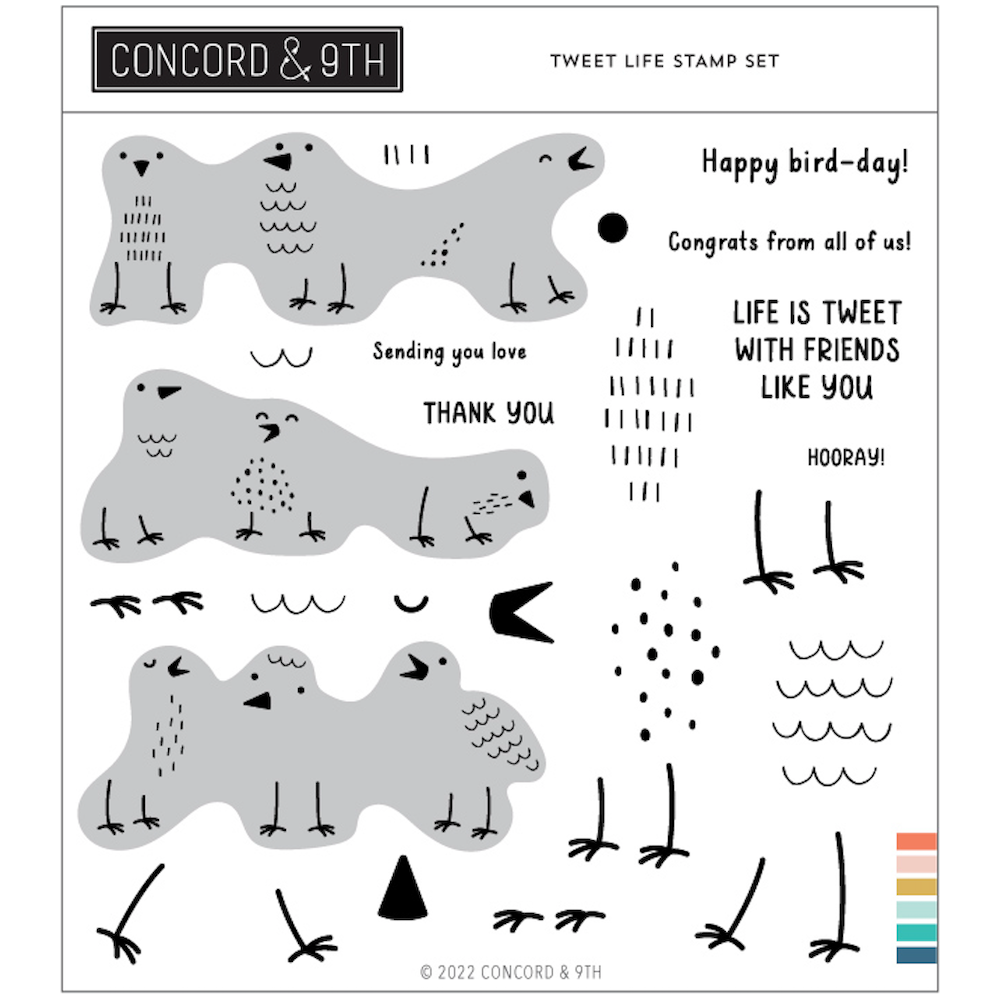 Infuse your cards with delightful charm using the Concord & 9th Tweet Life Clear Stamp Set! This set is designed to enhance and breathe life into the adorable birds crafted with the matching Tweet Life Stencil Pack. Plus, you'll find a variety of greetings that perfectly complement the stenciled imagery such as,