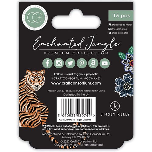 Set of 15, gold, metal tiger charms to coordinate with the Enchanted Jungle collection.