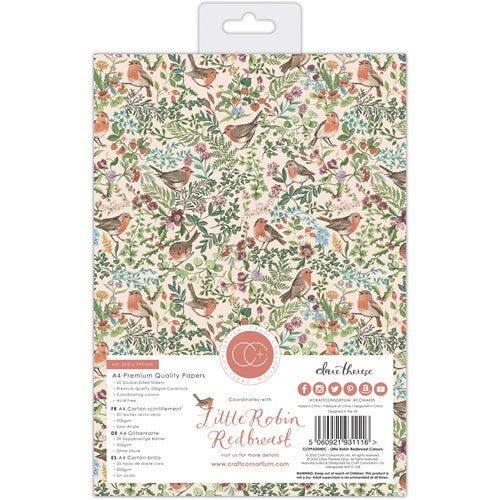 Premium A4 gummed cardstock pad. The pad contains 20 double sided sheets, 2 of each of the 20 colors, in heavyweight 200gsm, acid free cardstock. Ideal for, layering, die-cutting and distressing. The colors have been specifically selected to coordinate with the Little Robin Redbreast collection. Designed exclusively in partnership with Clare Therese Gray.