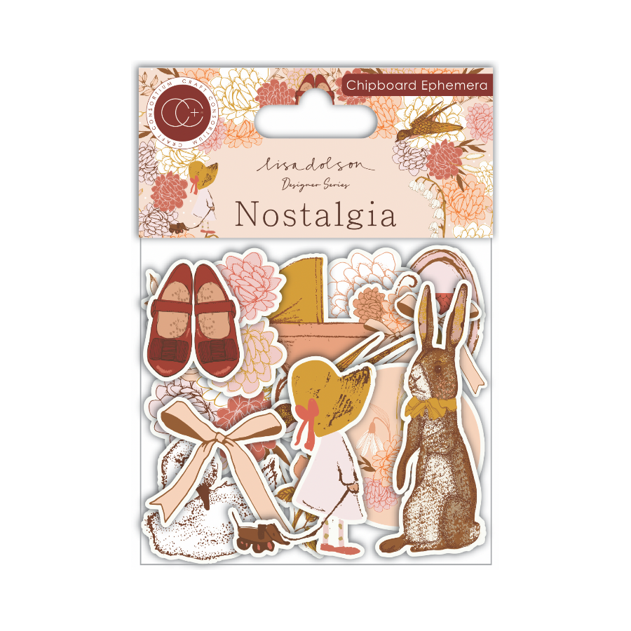 Craft Consortium Nostalgia Chipboard Ephemera is a set of premium die-cut embellishments printed on FSC Certified 300gsm heavyweight cardstock. Laser-cut for precise detail, this set features warm, vintage-style imagery including nostalgic toys, florals, leafy vines, and a charming girl in a large bonnet. Ideal for adding accents or focal points to cards, journals, and mixed media projects. Approximately 39 pieces included