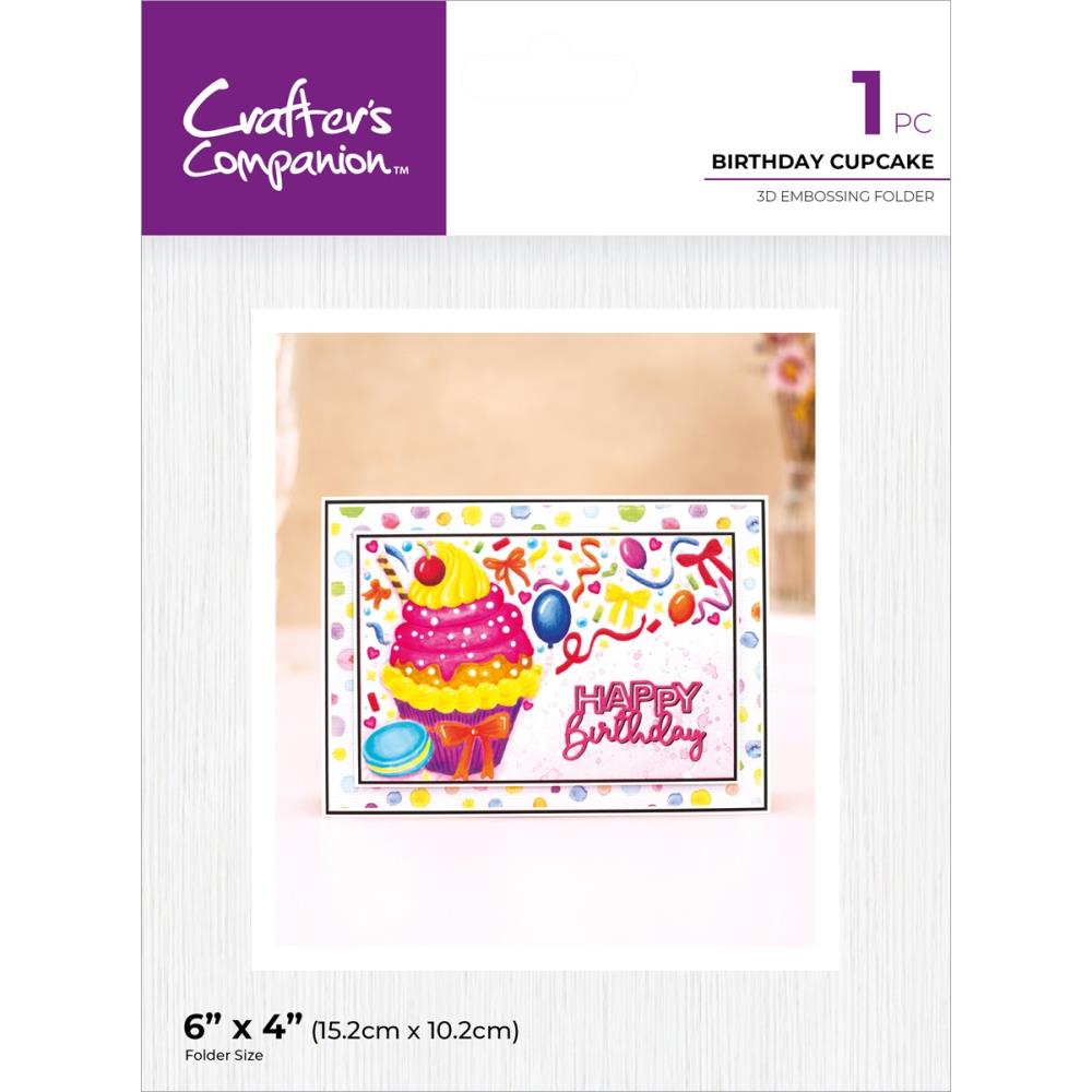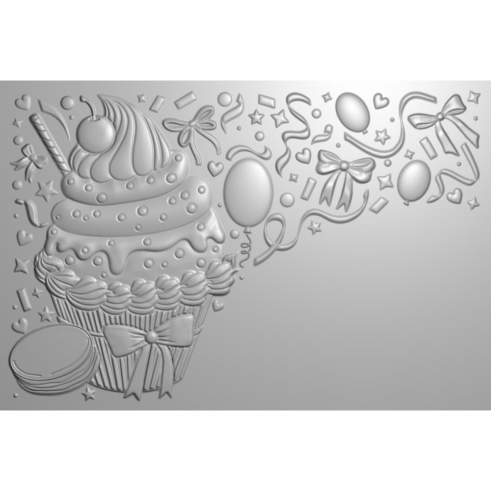 This 6 x 4 inch embossing folder features a raised and embossed design of a cupcake with surrounding celebration ribbon and balloons. It is compatible with popular die-cutting and embossing machines, including the Midi, Junior, and Gemini II. The Crafter's Companion Birthday Cupcakes 3D Embossing Folder allows for partial embossing, leaving space for additional embellishments like toppers, stamps, and gems. To enhance the design, add color with inkpads for a vibrant finish.