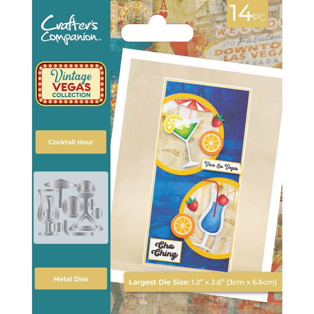 Easily create realistic cocktail and garnish shapes with the Vintage Vegas Metal Die - Cocktail Hour from Crafter's Companion. This 12-piece set is compatible with various die-cutting and embossing machines and can cut through a variety of materials including paper, card, tissue, vellum, and foil. Use them as toppers for handmade projects or precisely cut designs directly onto your card front. With its intricate details, this die set is a must-have for any cocktail lover or crafting enthusiast. The largest die size is approximately 3.2 x 3.7 inches.