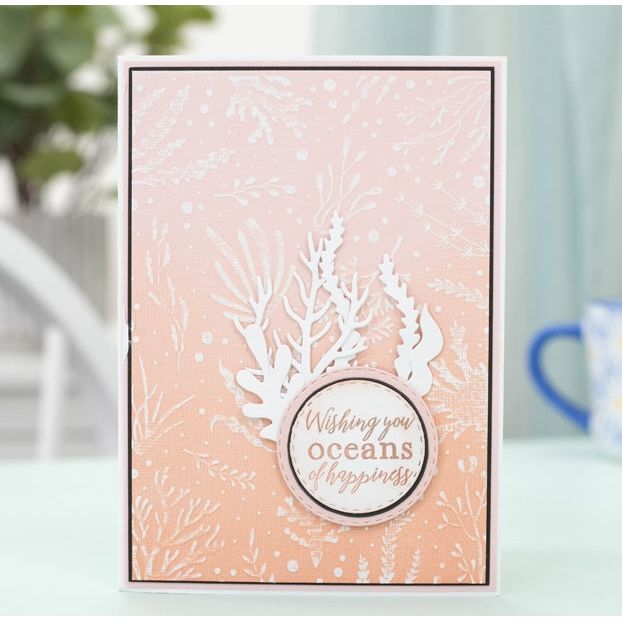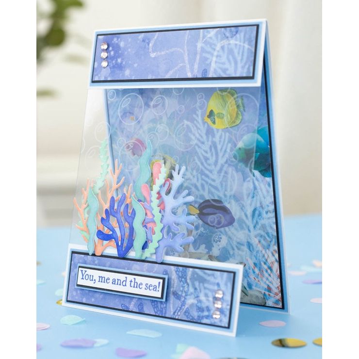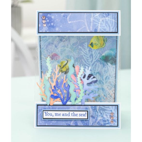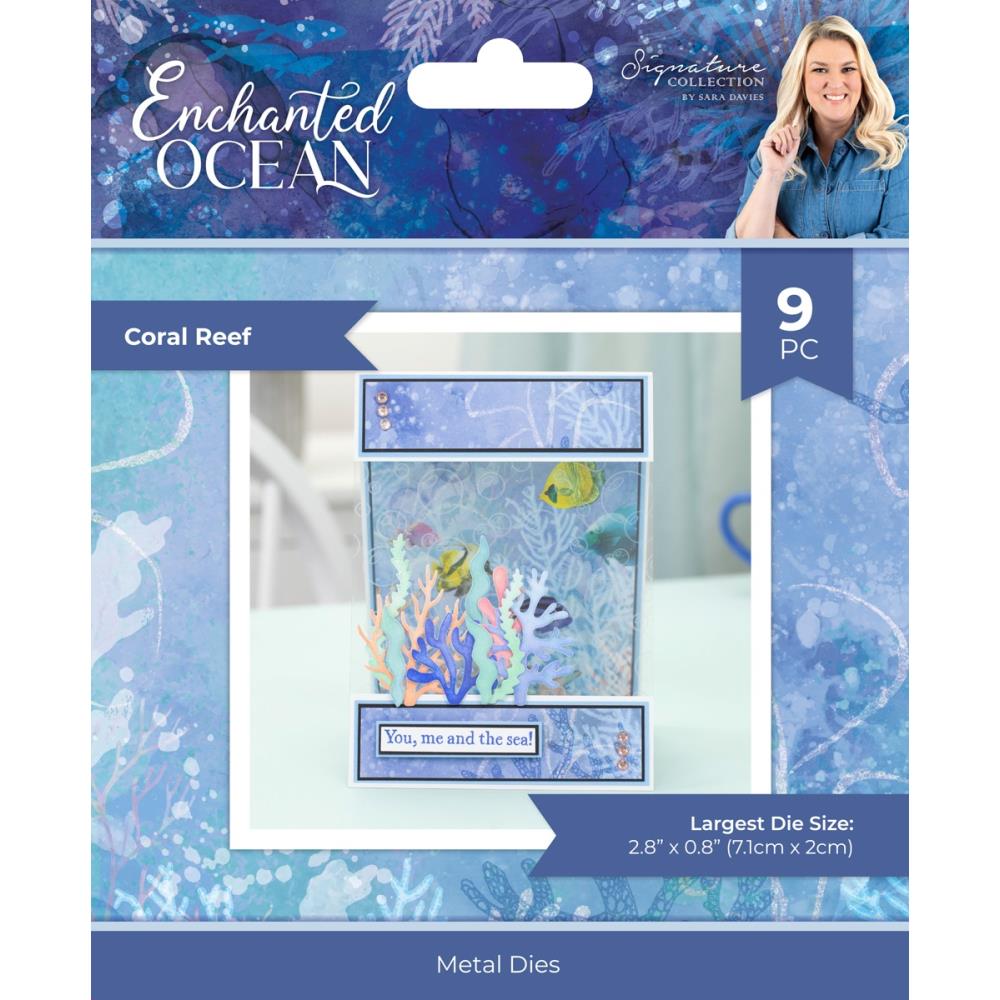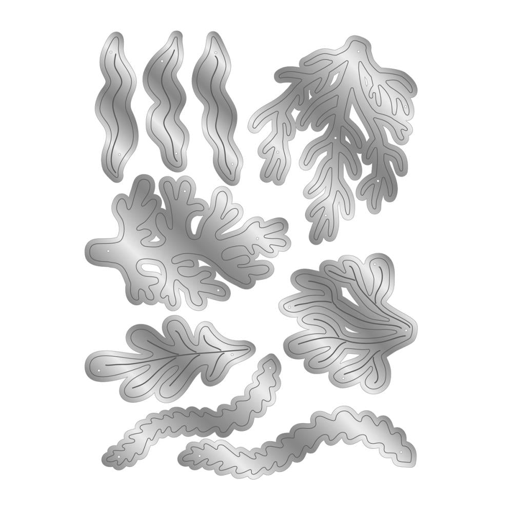 Craft stunning underwater scenes with Crafter's Companion Coral Reef Dies. This set includes 9 metal dies featuring intricate seaweed and coral. Let your creativity dive deep with the Sara Signature Enchanted Ocean collection and its separate pieces. The largest die in this set is approximately 2.8 x 0.8 inch.