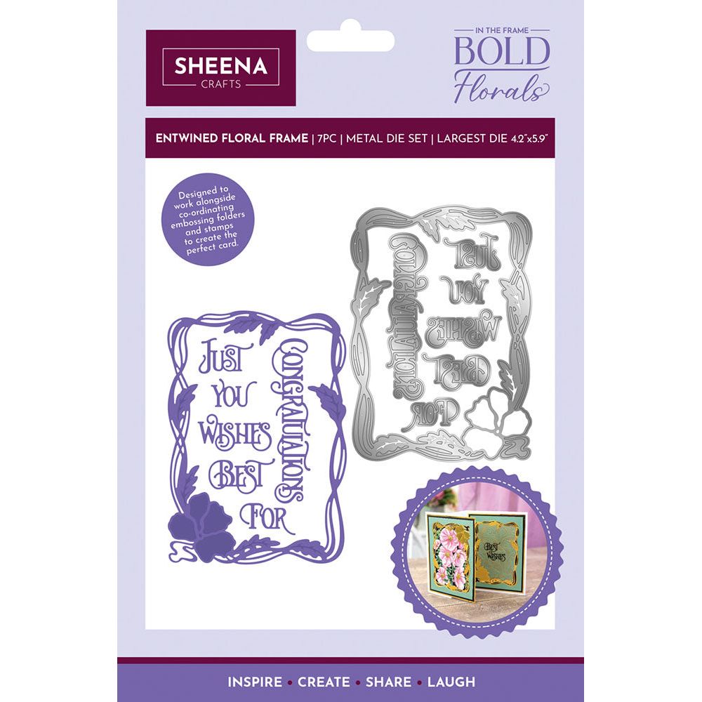 The Entwined Floral Frame dies by Sheena Douglass are ideal for crafting the perfect card, and can be used in conjunction with coordinating stamps and embossing folders. This die set includes 7 metal dies, with the largest measuring approximately 4.2 x 5.9 inches.