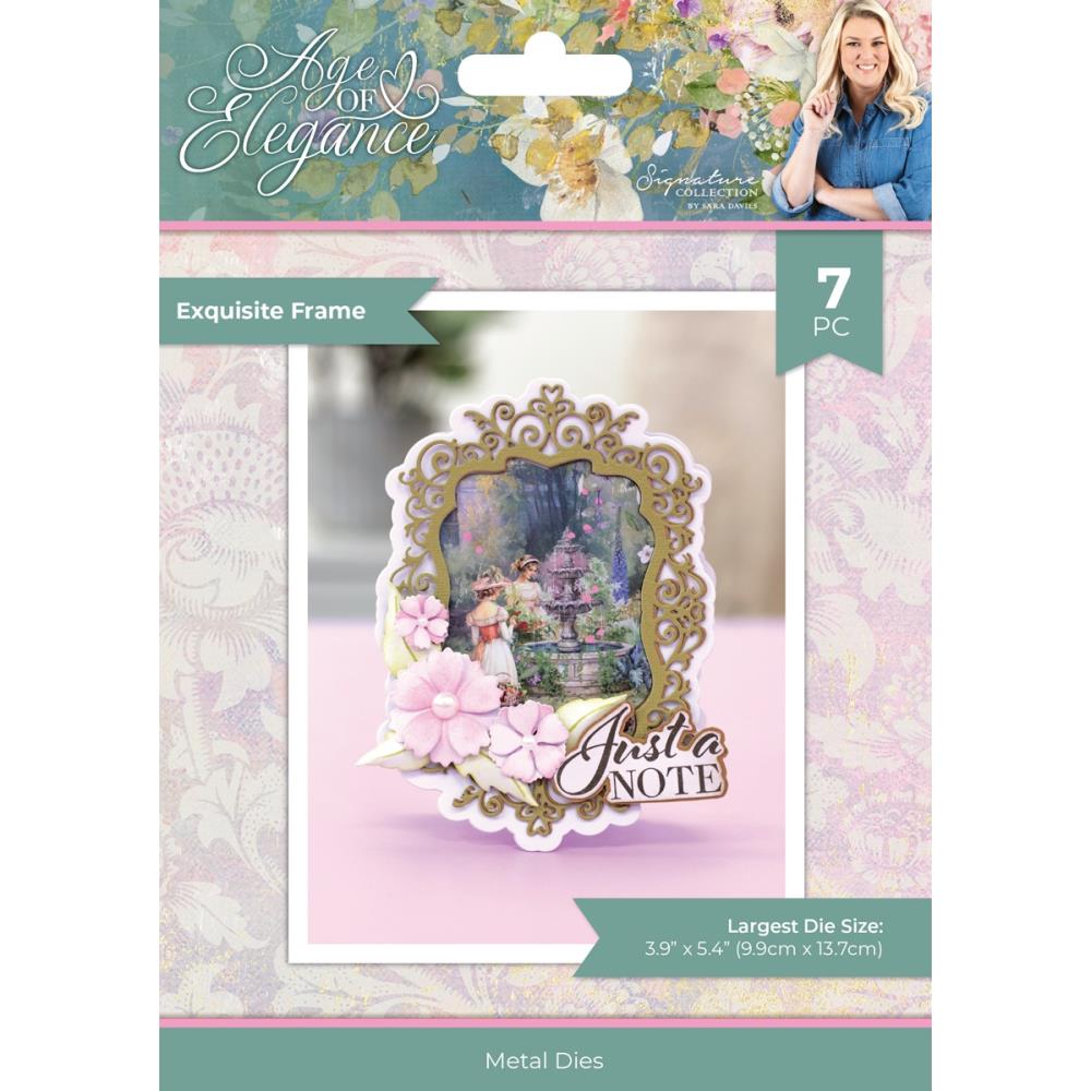 Create a beautiful setting for treasured photographs with the Sara Signature Age of Elegance Exquisite Frame set. This set includes seven metal dies that cut out an ornate rectangular frame and five delicate flower and leaf shapes. Use these dies to personalize keepsake cards for weddings, anniversaries, and other special occasions. The largest die measures 3.9 x 5.4 inches and is compatible with Gemini II and Gemini Midi die cutting and embossing machines. Cut materials such as paper, card, tissue, vellum, and foil to add stunning detail to your designs. This set is a part of the Sara Signature Age of Elegance collection, perfect for crafting an opulent and elegant atmosphere for your cherished memories.