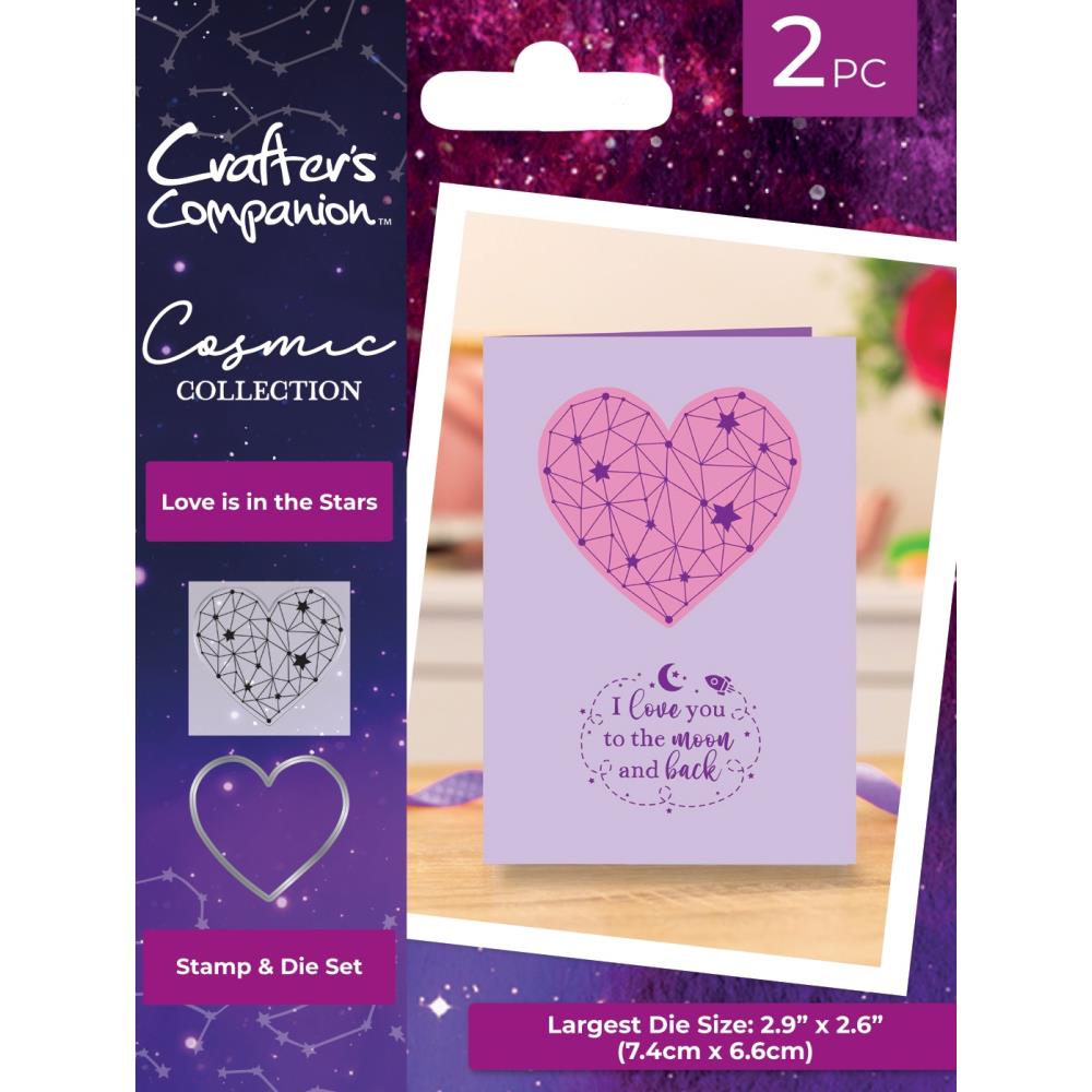 Elevate your crafting with the Crafter's Companion Love Is In The Stars Stamp And Die Set. Create vibrant projects influenced by the world beyond our skies. Largest die size: 2.9 x 2.6 inches.