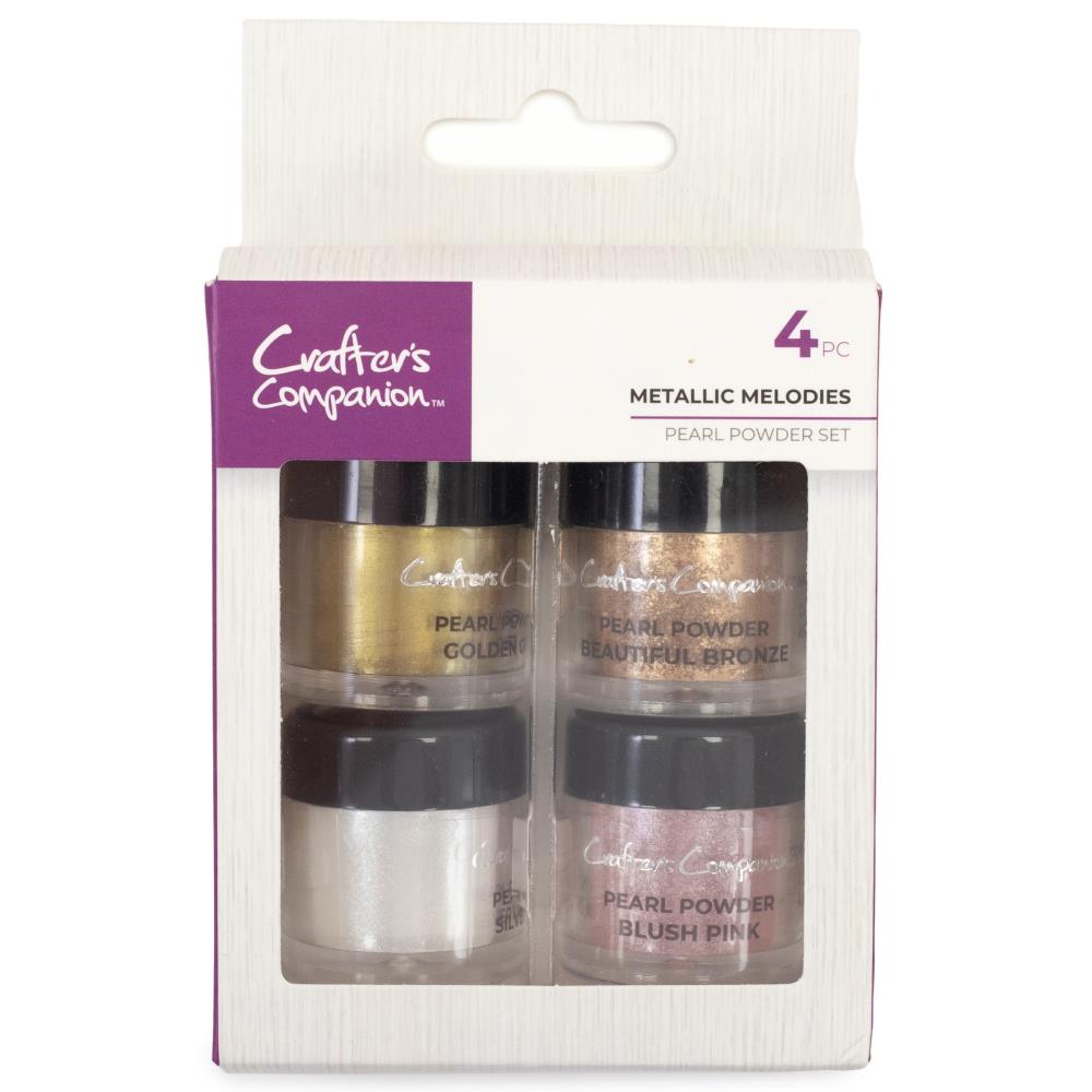 Enhance your projects with shimmering effects using Crafter's Companion Pearl Powder - Metallic Melodies. This versatile powder comes in four shades - gold, bronze, silver, and blush pink - and can be used alone, with stencils, or mixed for beautiful ombré effects. Simply sprinkle on and set with a spritz of water. For more intricate designs, use a Watermark Ink pad, sprinkle on the powder, and brush it onto the ink before setting with water. Each 2.5g pot includes a sprinkling attachment in the lid for precise application. Get the Metallic Melodies set now for stunning results.