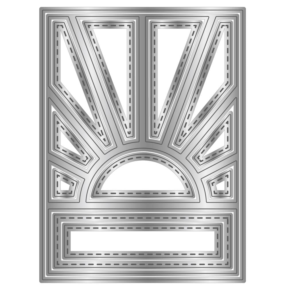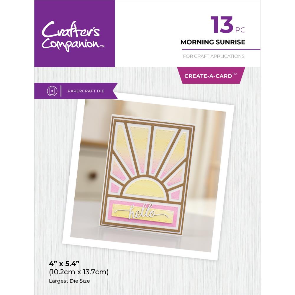 Elevate your card-making with the Crafter's Companion Morning Sunrise Dies set. These expertly designed dies, compatible with leading machines, allow you to easily cut a stunning sunrise design onto card fronts. The set includes 13 dies, with the largest one measuring 4 x 5.4 inches. Use the panel dies to create a window effect or the outer dies for an aperture effect. Made as part of the Patchwork Create-a-Card Dies range, these bold retro designs are perfect for adding an extra touch of elegance to your handmade cards and invitations. Don't settle for basic designs - use these intricate dies to cut through materials like acetate, glitter card, and vellum to create show-stopping designs that will impress anyone who receives them. You'll love the level of detail and precision that die-cutting offers, making it a must-have tool for any expert crafter.