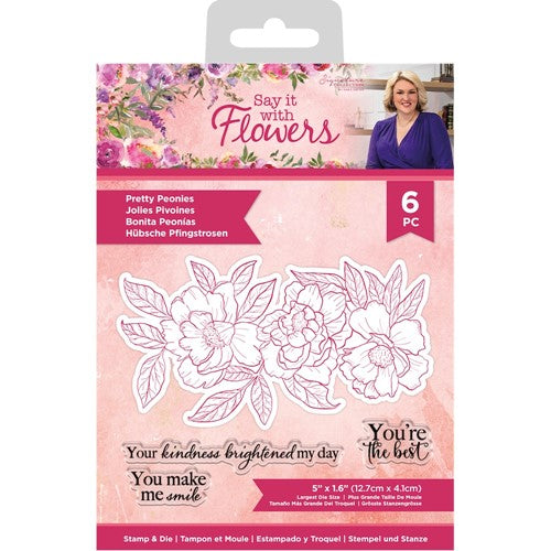 Four stamps and two dies Largest die size is 5 x 1.6 inches Create a beautifully illustrated garland of soft, ruffled peonies in full bloom. from the Sara Signature Say it With Flowers collection