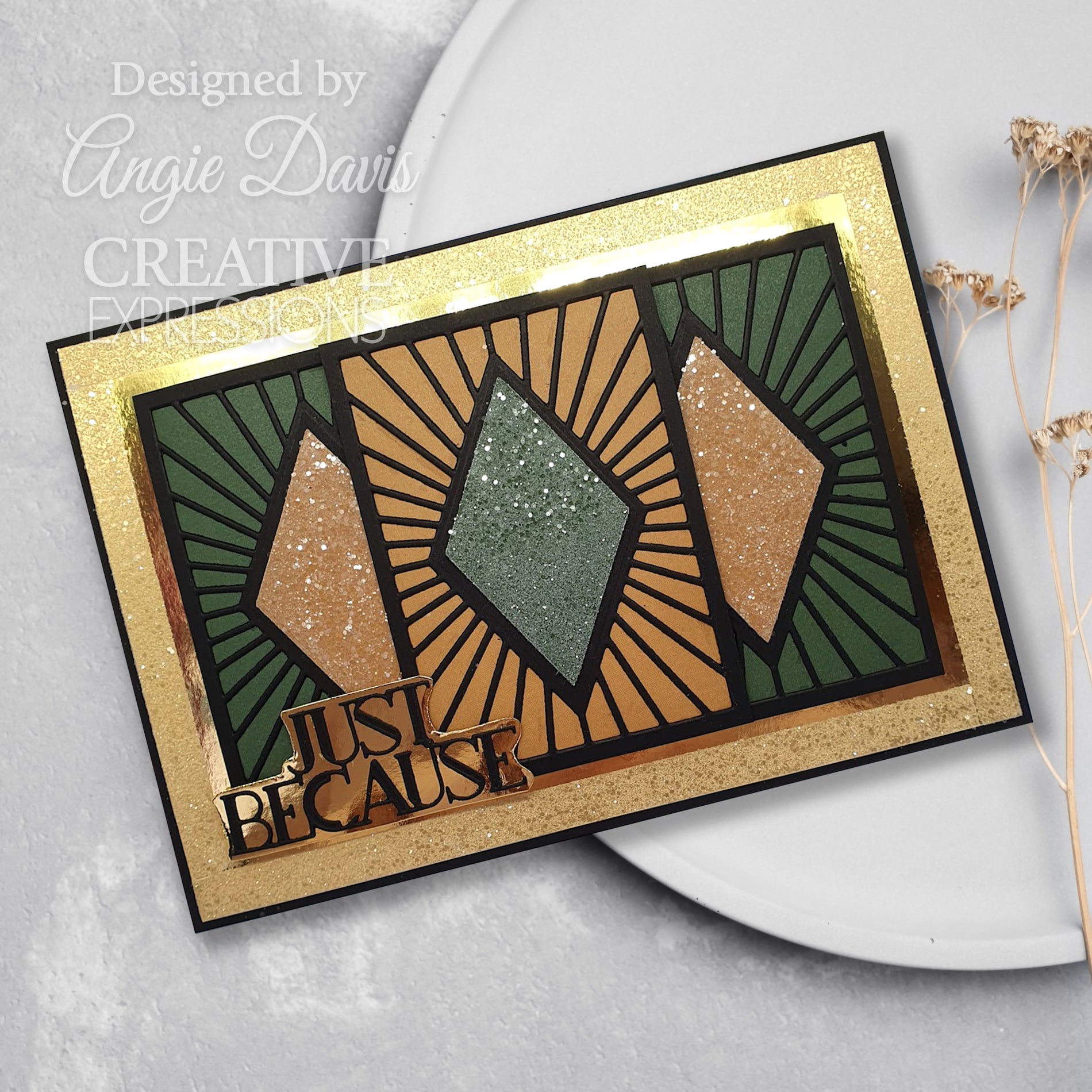 The Creative Expressions Art Deco Diamond Radiance Background Dies, part of Sue Wilson's Art Deco Collection, add an elegant touch to your projects. Perfect for creating stunning card fronts or adding backgrounds to cards or scrapbook pages, these high-quality, wafer-thin steel dies re compatible with most die-cutting machines. The set includes 5 dies, with the largest measuring approximately 5.4 x 4.3 inches. Featuring a rectangular design with a diamond in the middle and rays emanating out to the box, these dies also create a border frame and background elements. With clean lines and intricate details, you can cut out pieces to create unique shapes for your crafting endeavors.