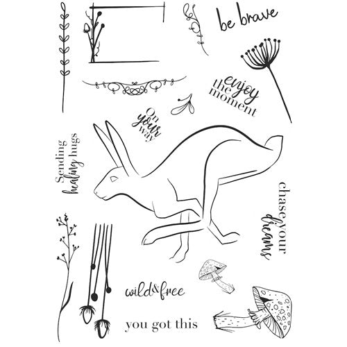 This determined looking kangaroo is accompanied by useful funny phrases and other flora and fauna inspired designs. Ready to mount on an acrylic block the polymer stamps can be used with ink pads, paint, or used with pigment ink and embossing powder. They are suitable for paper, fabric, or any other surface depending on the ink choice. Designed by Bonnita Moaby. 6x8 set includes 18 stamps.