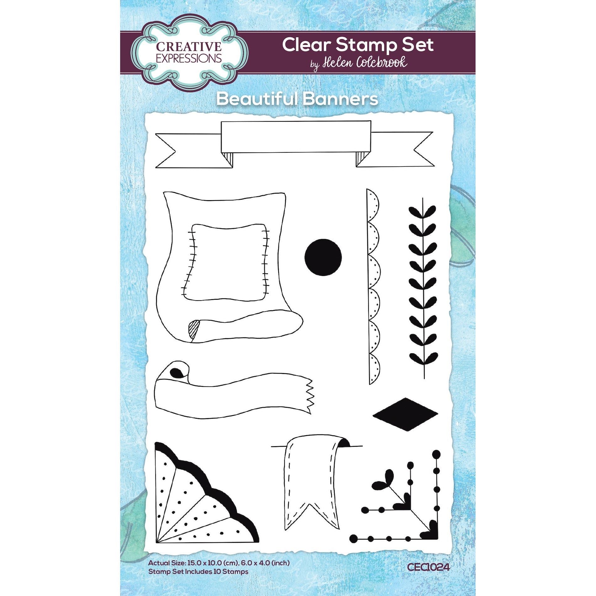 The Creative Expressions Beautiful Banners Clear Stamps, a truly delightful and versatile stamp set designed by the talented journaler, Helen Colebrook! Designed with precision and artistic flair, these high-quality photopolymer stamps come in a 4 x 6-inch set, featuring a total of 10 pieces. The set includes various beautiful banners, a charming scalloped border, a corner fan shape, a corner heart piece, a circle, paper, and a stem with leaves. For added inspiration and creativity, mix and match with Helen's stencils, ephemera, and papers.