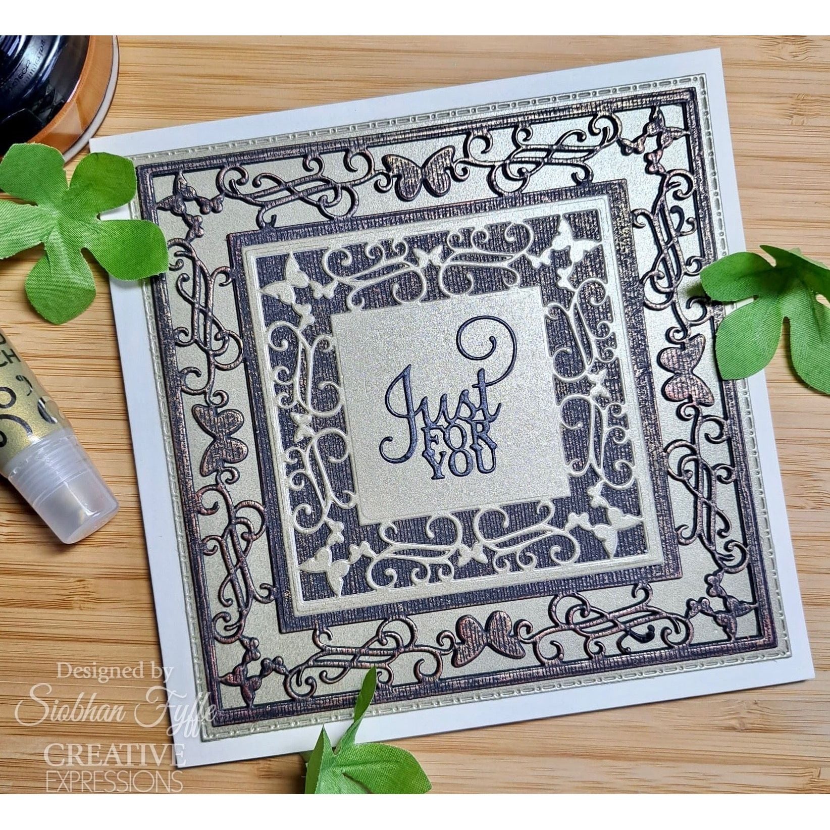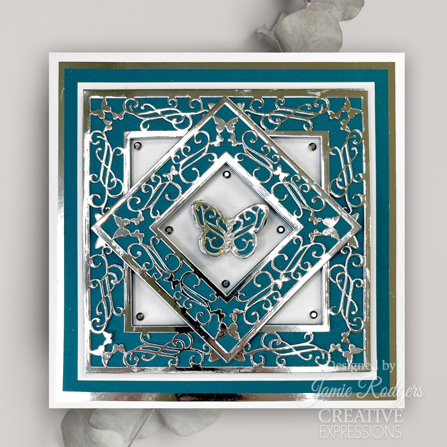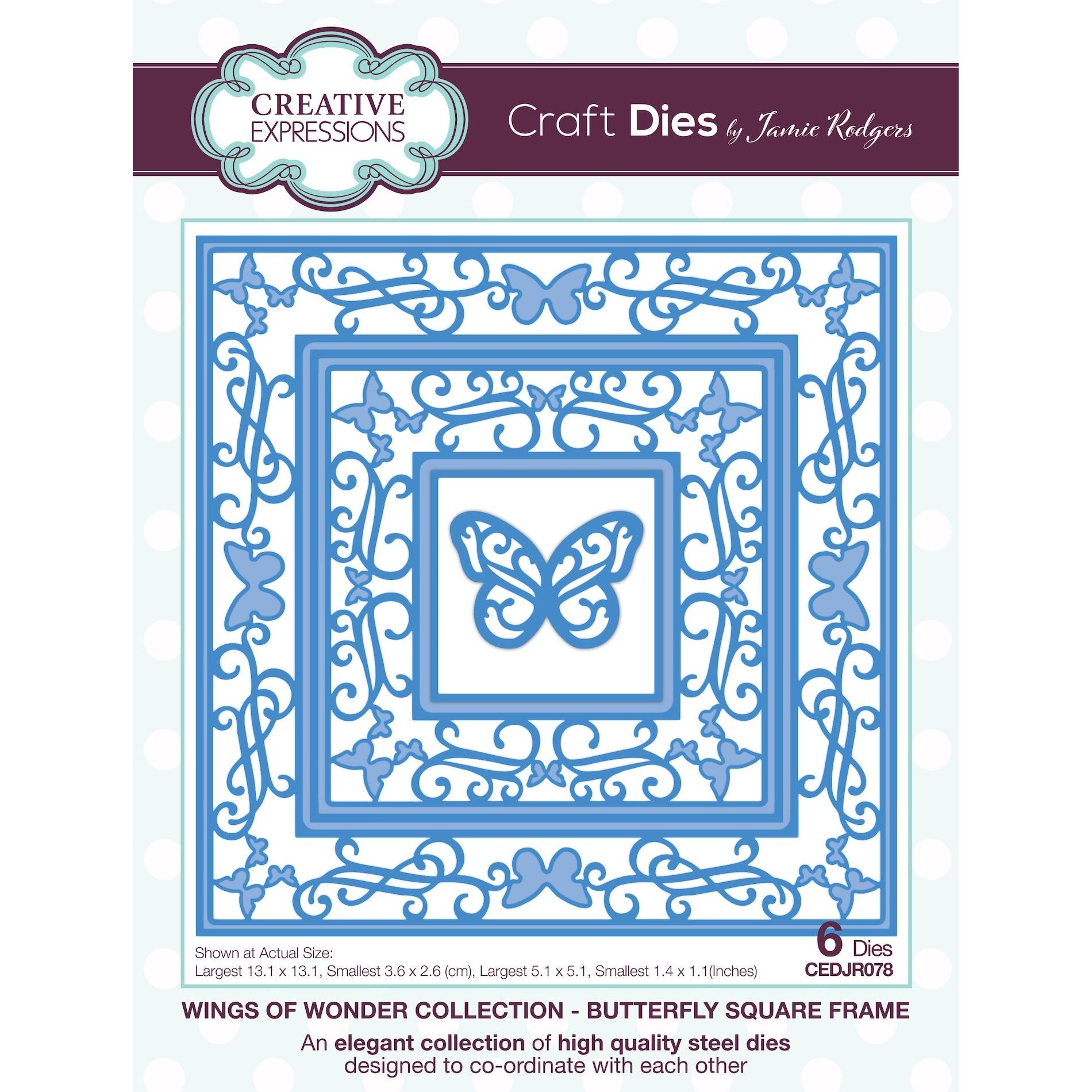 The Creative Expressions Butterfly Square Frame Die set is a captivating design by Jamie Rodgers. This square frame die set is perfect for creating stunning card fronts, showcasing intricate patterns and textures inspired by elegant butterflies. Compatible with most home die-cutting machines, these dies ensure ease of use and accessibility for crafters of various skill levels. The set includes six dies, consisting of five squares and one single butterfly. Four of the dies feature single open squares in different sizes, allowing for layering and versatile design options. The remaining two dies are border squares, adorned with delicate flourishes and butterflies inside, adding an extra touch of beauty to your creations. The largest die measures approximately 5.1 x 5.1 inches, while the smallest die measures approximately 1.4 x 1.1 inches. With its exquisite details and versatile design, this set offers endless creative possibilities for your card-making and other paper craft projects.