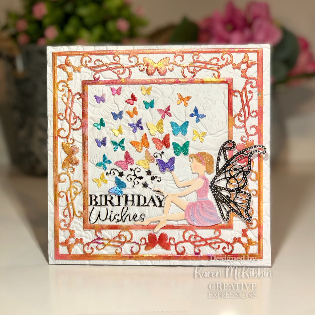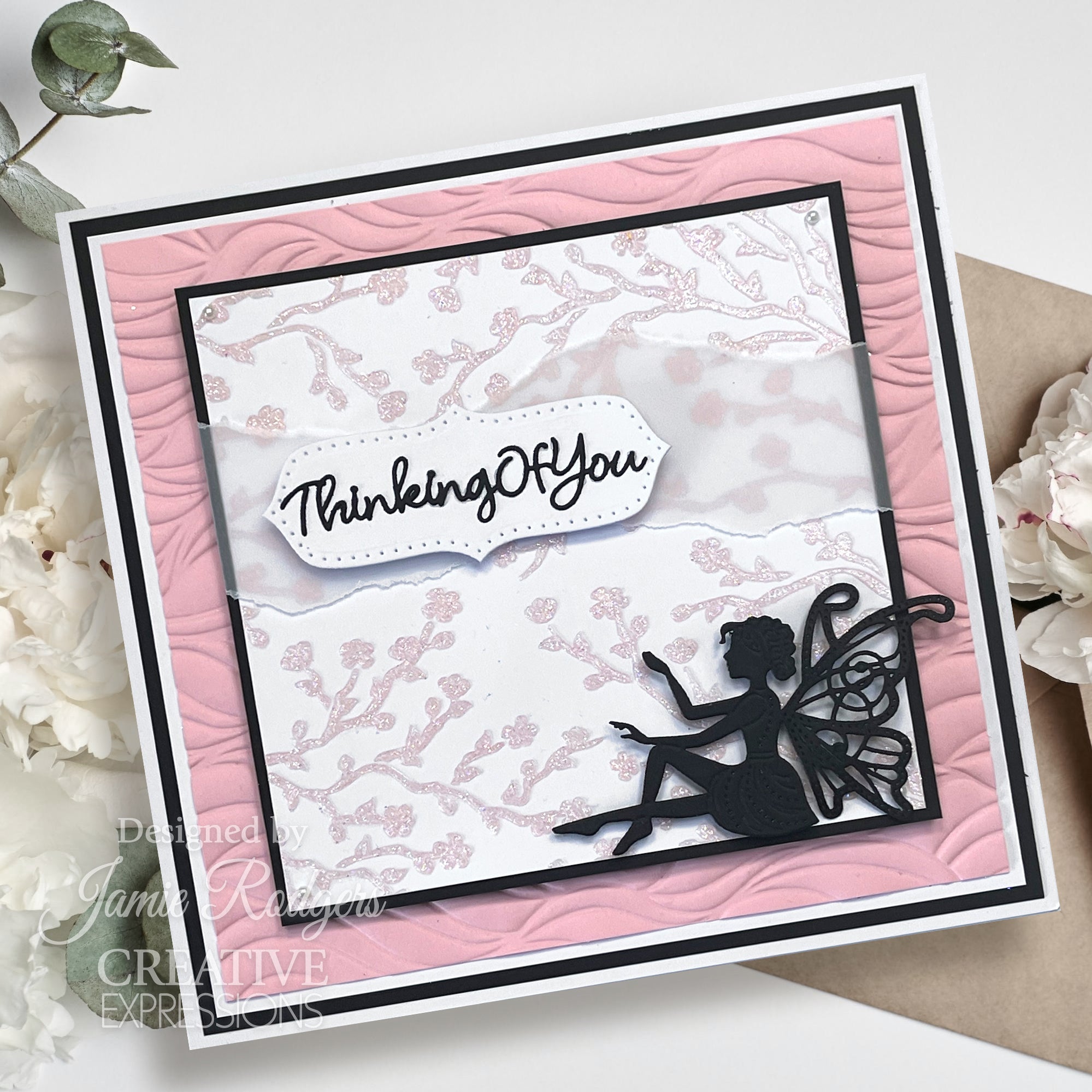 This Fluttering Ivy Die is part of Jamie Rodgers’ gorgeous Fairy Wishes Collection. The high-quality, wafer-thin steel dies are compatible with most die-cutting machines. This set has four dies, with the largest measuring approximately 3.3 x 2.6 inches. It includes a sitting fairy with ornate wings and outstretched arms, stars adorned with flourishes, butterflies, a wand, and the phrase 'Birthday Wishes' to enhance your creative projects.