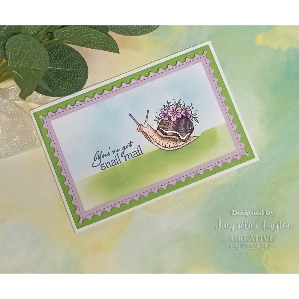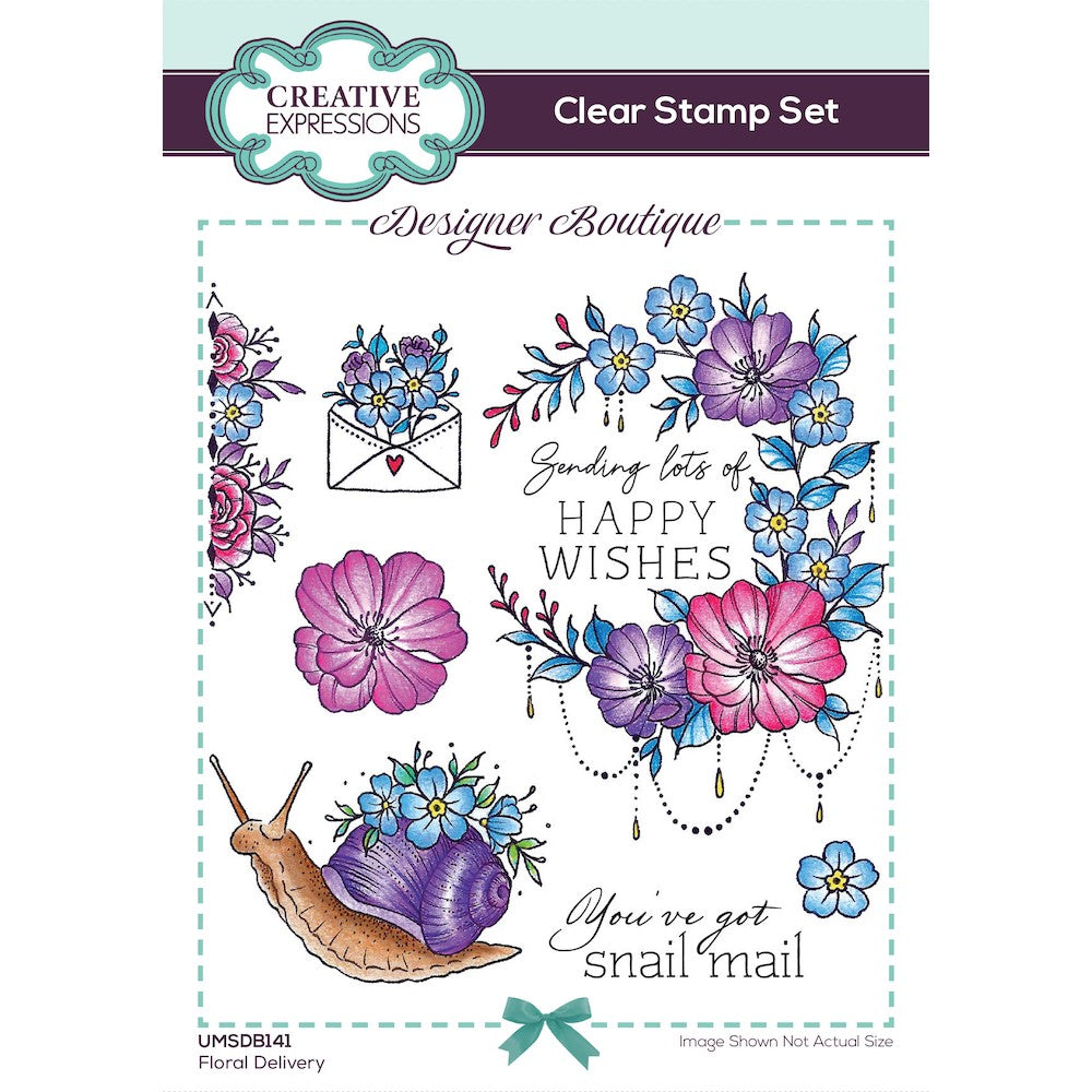 Designer Boutique Collection. This set will be great for cards, mixed media and other craft projects, try stamping them on fabric or use them for home decor projects. Ready to mount on an acrylic block the stamps can be used with ink Pads, paint, or used with pigment and embossing powder. High-quality polymer stamps. Carefully remove the stamps from the carrier sheet and they are ready to use. Set includes flowers, a butterfly, blooms, a snail, envelope and the sentiments Sending Lots of Happy Wishes and You’ve Got Snail Mail. This 6x4 inch clear set includes 7 stamps.