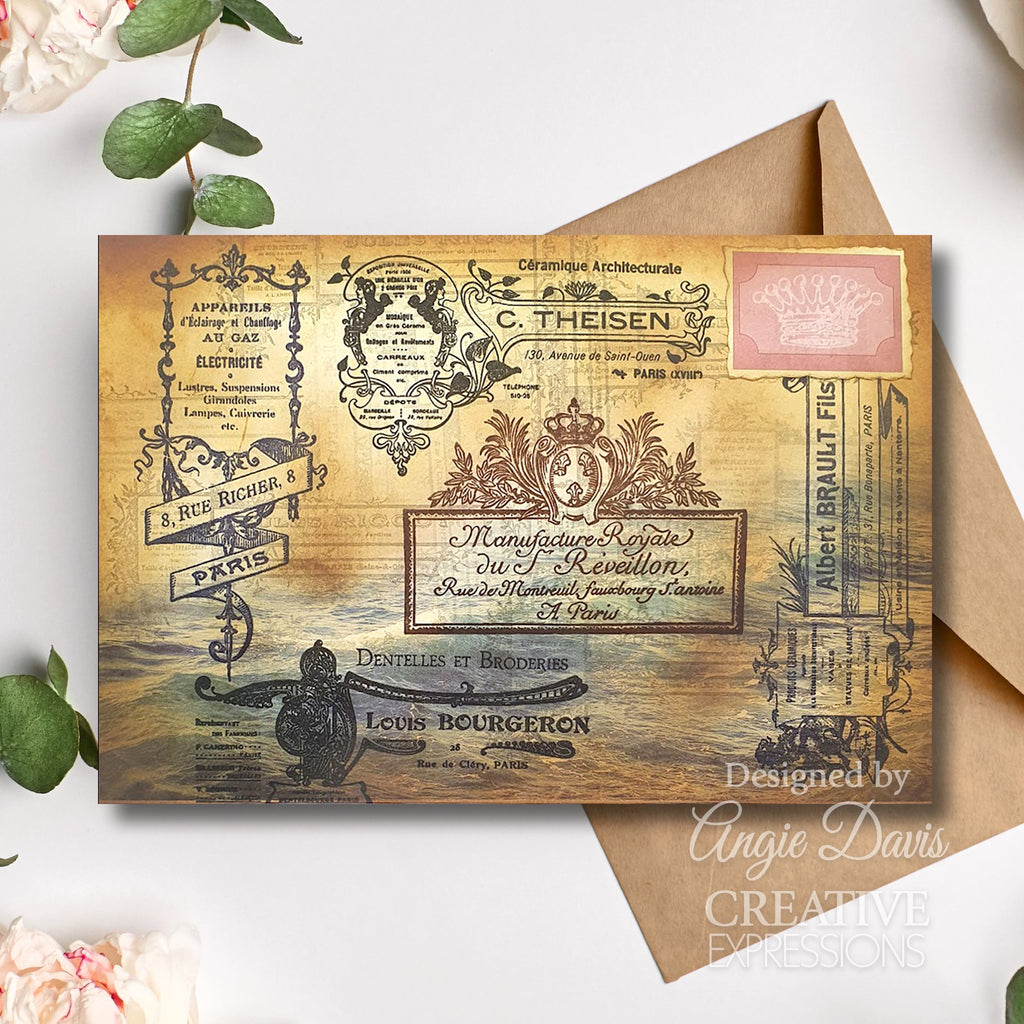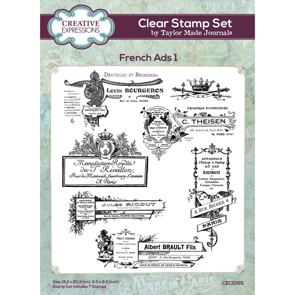 Creative Expressions French Ads 1 Clear Stamps is a vintage-inspired clear stamp set designed by Taylor Made Journals, perfect for enhancing your creative projects such as cards, journals, and home decor. Crafted from high-quality photopolymer, these clear stamp sets are perfect for adding captivating images to your artistic endeavors. Measuring 6 x 8 inches, this set comprises seven stamps. The collection features a range of vintage advertisements, including Dentelles et Broderies Louis Bourgeron, Manufacture Royal du Reveillon, Jules Rigout, Albert Fils Products Ceramiques, Apparels d’Eclairage et Chauffage au Gar Electricite, Cermique Architectural C Theisen, and a captivating photo of crowns and crossing swords. Elevate your creative projects with the charm of these exquisite clear stamps.
