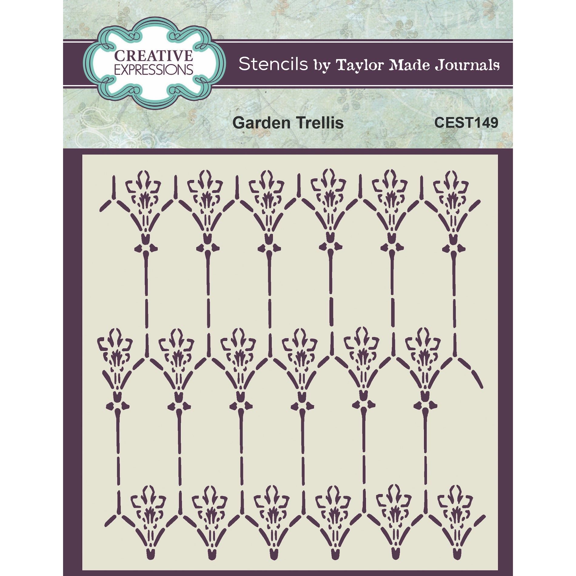 The Creative Expressions Garden Trellis stencil from Taylor Made Journals is a versatile tool perfect for mixed media, card making, scrapbooking, textile art, and more. Crafted from durable mylar, this stencil is designed to withstand various artistic mediums. These stencils can be used individually or in combination, offering endless creative possibilities. Measuring approximately 6 x 6 inches, this vintage-inspired stencil features a beautiful floral wrought iron trellis as its background.