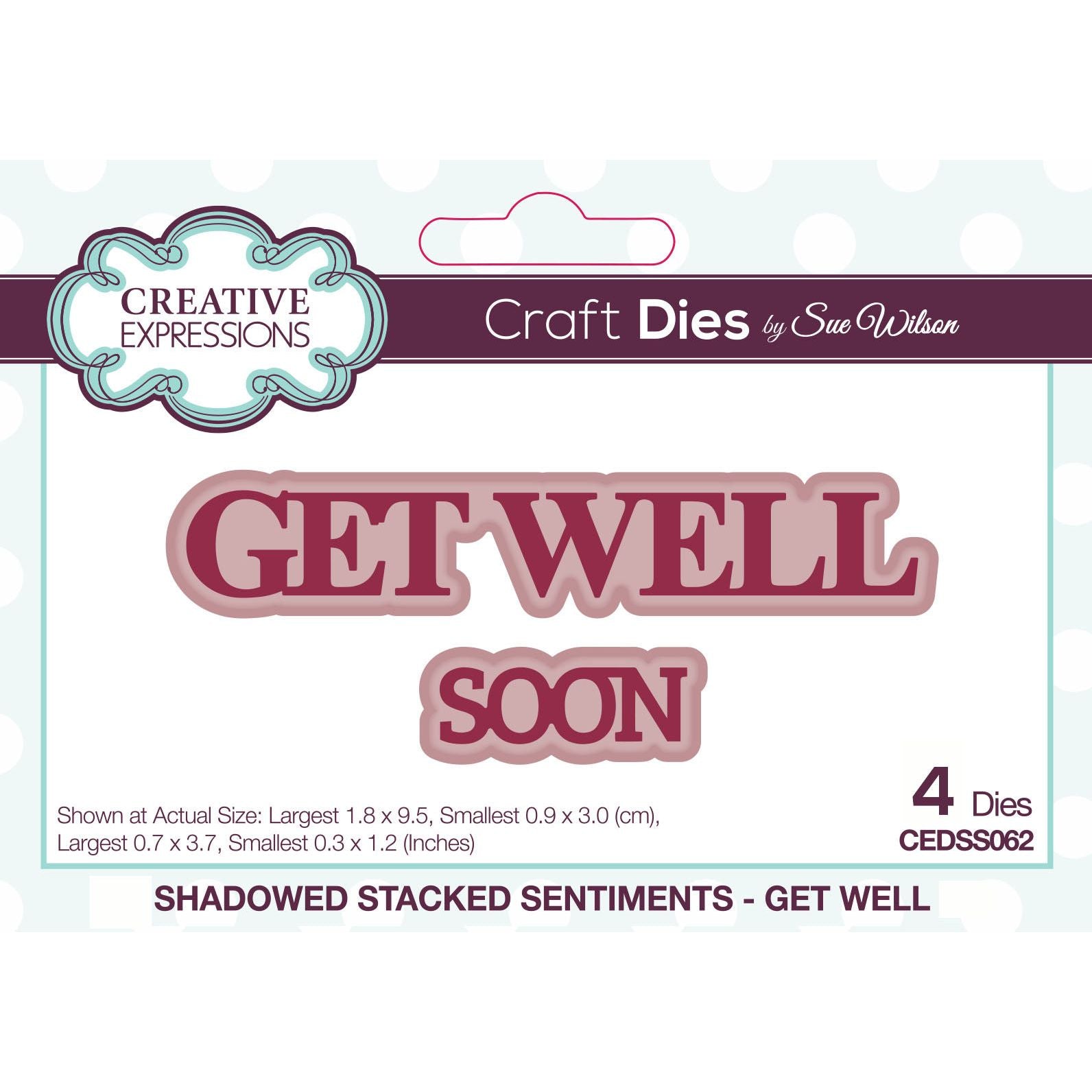 This Get Well Shadowed Stacked Sentiment dies, designed by Sue Wilson, are perfect to add the finishing touch to all your card and craft projects. This set includes four high-quality steel dies, with the largest measuring approximately 0.7 x 3.7 inches and the smallest approximately 1.2 x 0.3 inches. The set features the sentiment "Get Well" and "Soon" in an uppercase font, each with its accompanying shadow. These versatile dies are compatible with most home die-cutting machines, making them an excellent addition to any crafter's toolkit.