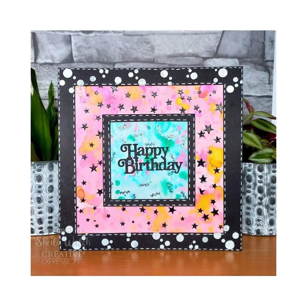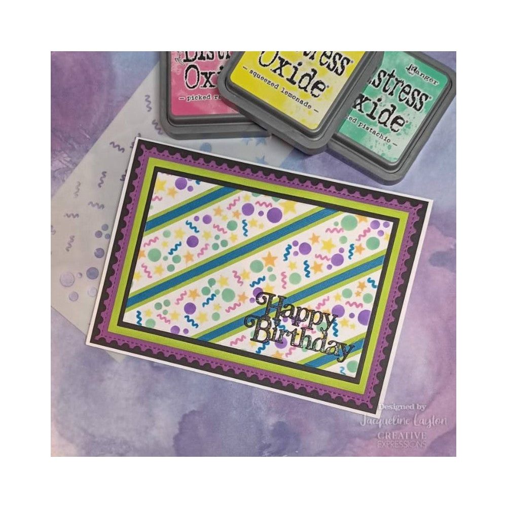 The stencil is 4 x 8 inches in size and features circles, stars, and streamers for confetti. It can be used with a variety of craft mediums including inks, paints, pastes, glazes, or misters, allowing you to create a wide range of effects and textures.