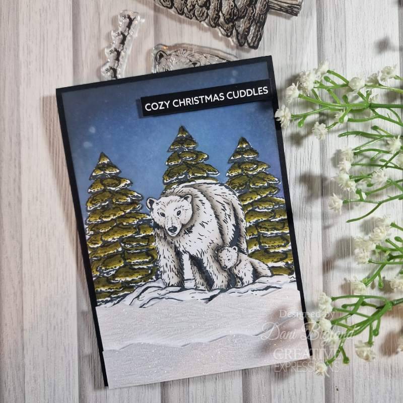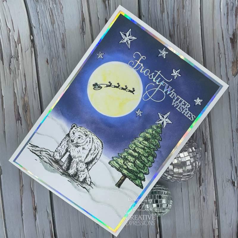 The Creative Expressions Polar Night Clear Stamps are part of the Designer Boutique Collection. This exquisite hand-drawn stamp set features a Polar Bear and Cub that can be used individually or combined with other stamps in the collection. These stamps are versatile and can be used for a variety of projects, including cards, scrapbook pages, and other craft projects. The stamps are ready to be mounted on an acrylic block and can be used with ink pads, paint, or pigment and embossing powder. Crafted with high-quality polymer, these stamps offer clear and crisp impressions. To use them, carefully remove the stamps from the carrier sheet, and they are ready to be inked and stamped. When you're done, simply wipe them clean with water, stamp cleaner, or a wipe. Once dry, you can return them to the carrier sheet and store them away from direct light to preserve their quality. The 4 x 6 inch clear stamp set includes 6 pieces, featuring a Polar bear and cub in the snow, a pine tree, three stars, and Santa Claus flying in his sleigh pulled by reindeer.