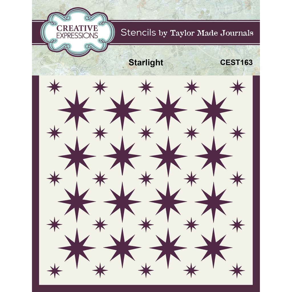 The Creative Expressions Starlight 6x6 Stencil from Taylor Made Journals Festive Collection is perfect for mixed media, card making, scrapbooking, textile art, and more. Made from durable mylar, this stencil can be used with paint, ink, ink pads, chalk, and sprays. It’s a great addition to your die-cutting and embossing machine. The stencil measures approximately 6 x 6 inches and features mid-century-style stars in different sizes, making it ideal for adding a retro touch to your projects.