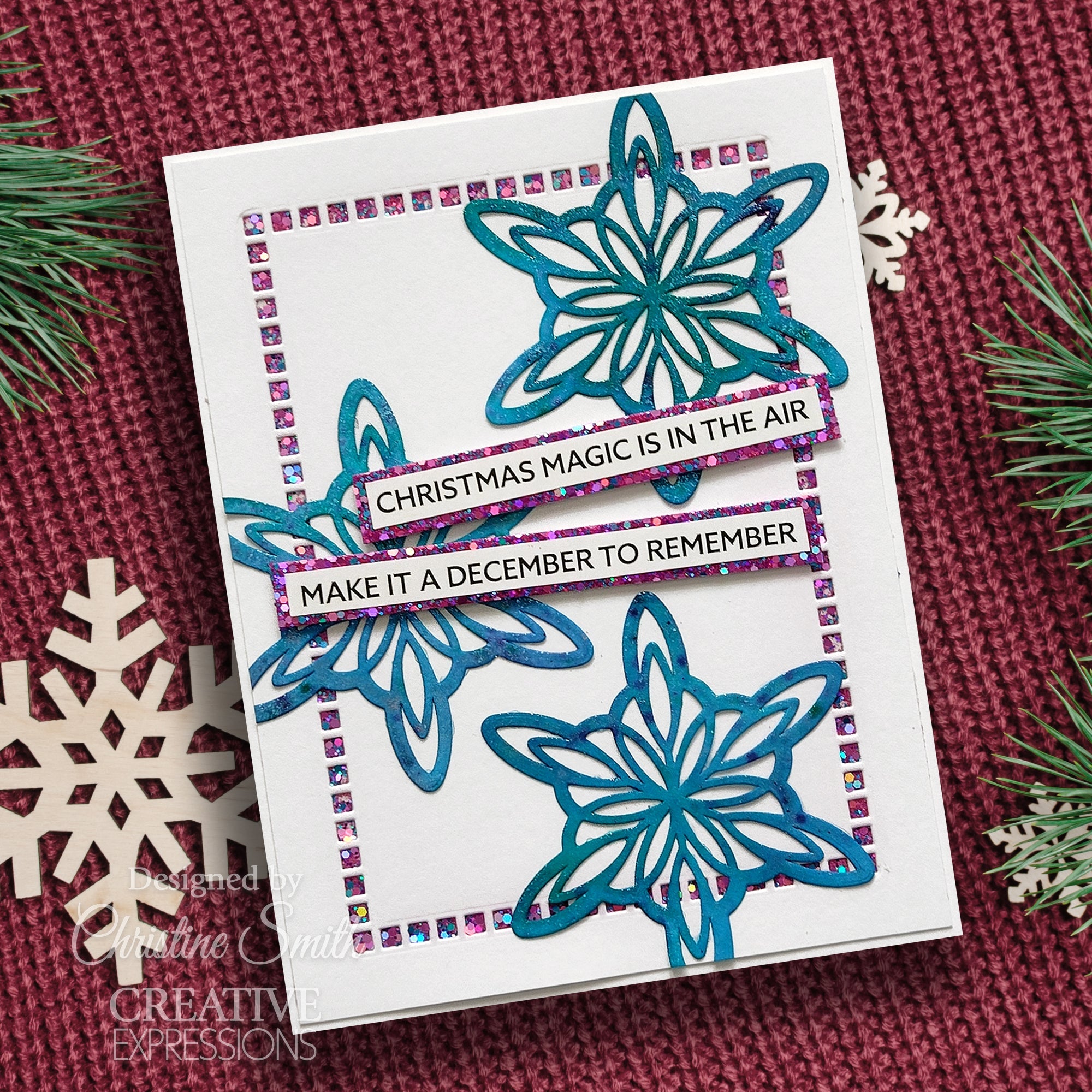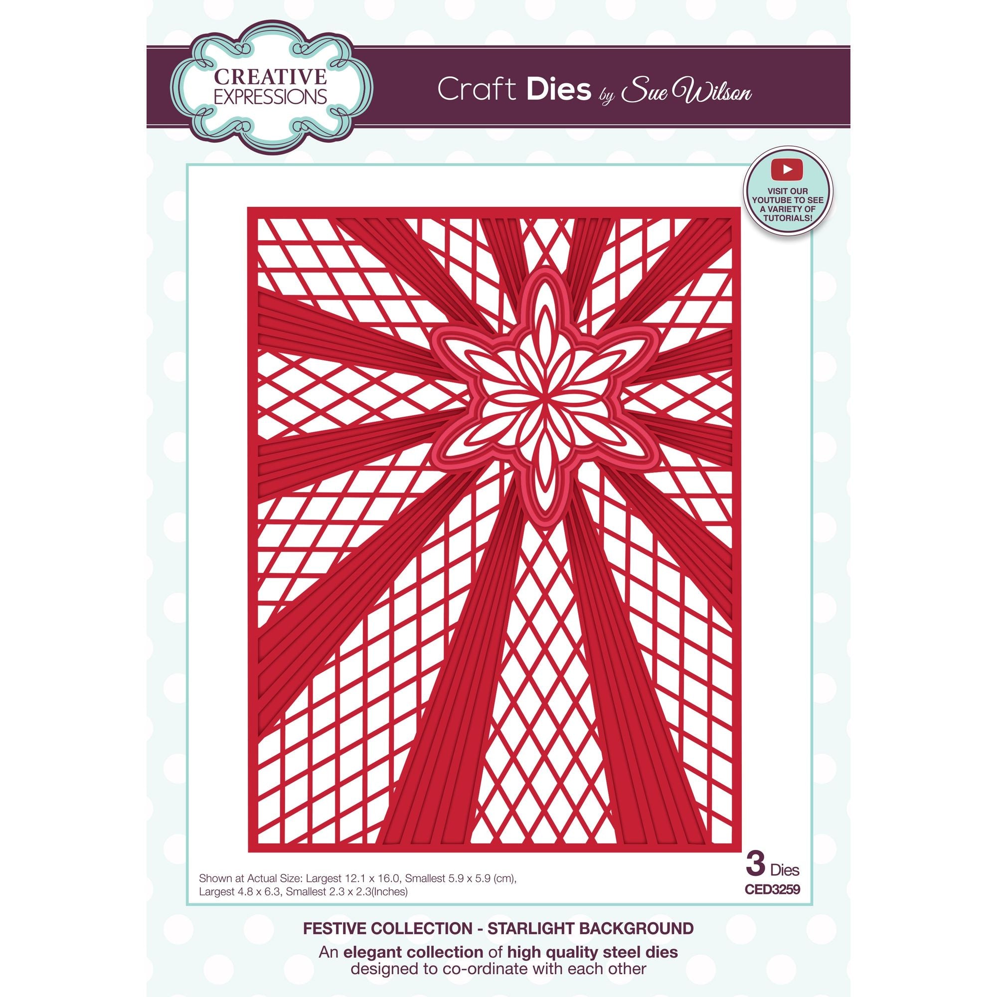 The Starlight Background craft die is part of Sue Wilson's Festive Collection. It is a versatile die that can be used to create a gorgeous card front with just one die or add backgrounds to cards or scrapbook pages. It offers a variety of design options when combined with the frames of other Stained Glass designs from the collection. The set consists of 3 high-quality steel dies. The largest die in the set measures approximately 4.8 x 6.3 inches. The dies are compatible with most home die cutting machines. The Starlight Background die features a large background design with rays emanating from a star or snowflake shape. It creates a beautiful and intricate pattern that adds a touch of elegance to your projects. Additionally, the set includes a snowflake die and a border die specifically designed for the snowflake.