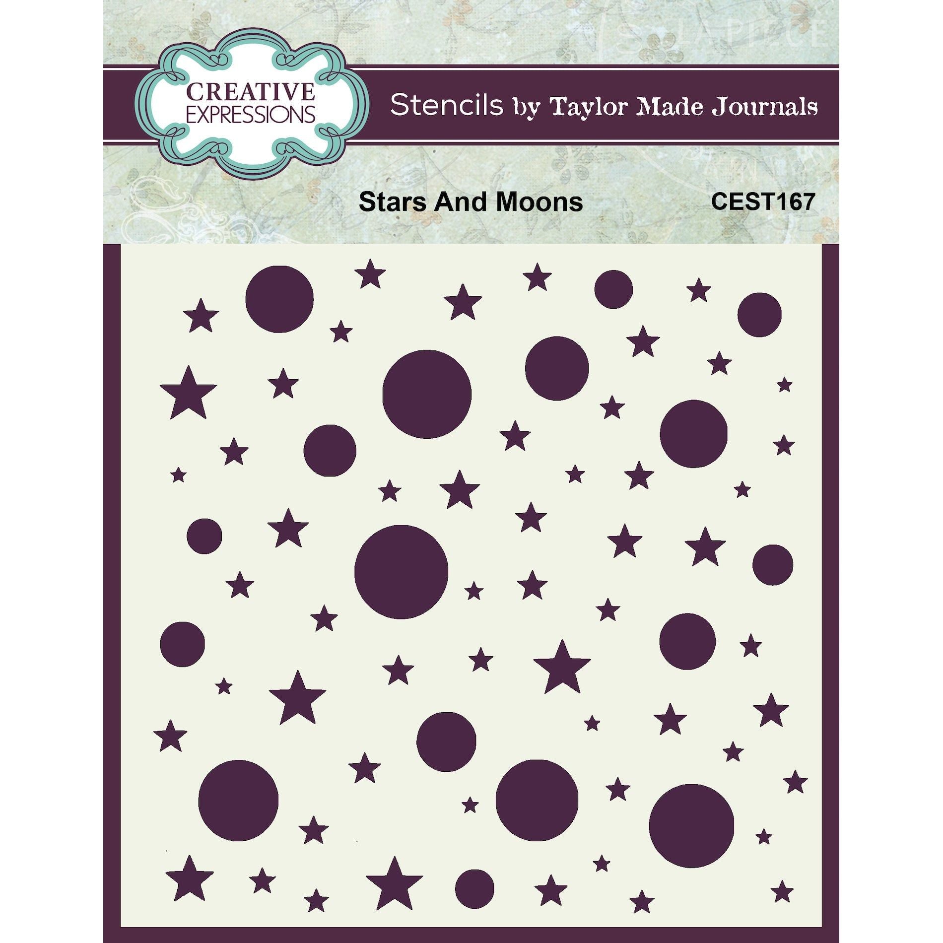The Stars and Moons stencil from Taylor Made Journals is ideal for mixed media, card making, scrapbooking, textile art, and more. Made from durable mylar, this stencil can be used with paint, ink, ink pads, chalk, and misters. Measuring approximately 6 x 6 inches, it features a background design of circles and stars.