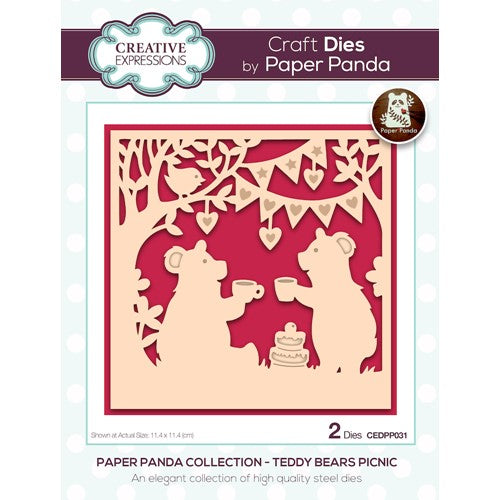 Paper Panda Collection. An elegant collection of high quality, wafer-thin steel dies. This fun Teddy Bears picnic design has been hand drawn by husband-and-wife duo Louise and Ryan Firchau, expert paper cutters. These gorgeous designs are created in a distinct and exquisite style. This die set comes with the cut out and a perfectly proportioned layer to sit behind it and make the image pop. The dies are compatible with most home die cutting machines. 6x6 set includes 2 dies. Largest is approximately 4.5 x 4.5 inches.