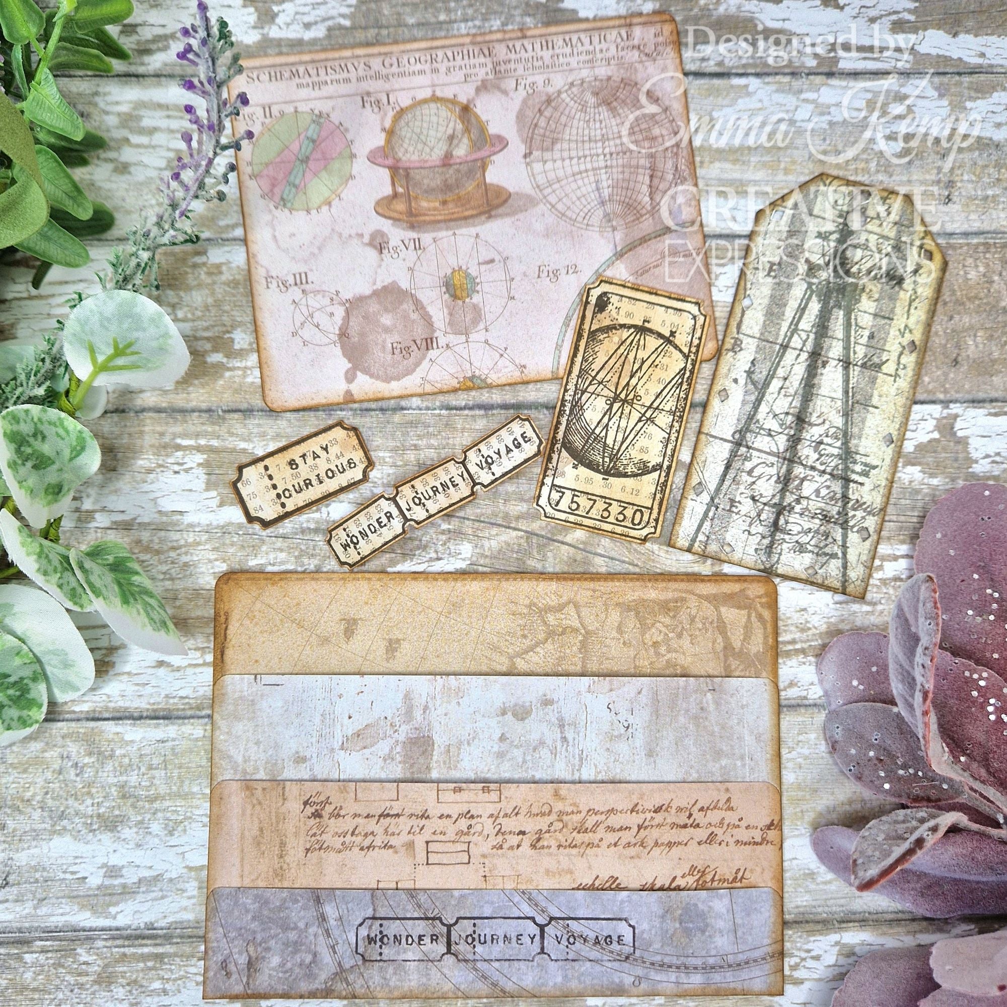The Astrologist paper pad, designed by Sam Poole, features a captivating collection of nature-inspired designs. This pad includes 24 double-sided patterned papers, each measuring approximately 8 x 8 inches and weighing 150gsm. The collection offers 6 unique designs, with 4 sheets of each. The designs range from columns of numbers with spills, grungy textures, astrological maps, and planets to coordinates, scientific drawings and schematics, mathematical equations, and more. Perfect for adding a touch of celestial and scientific intrigue to your projects.