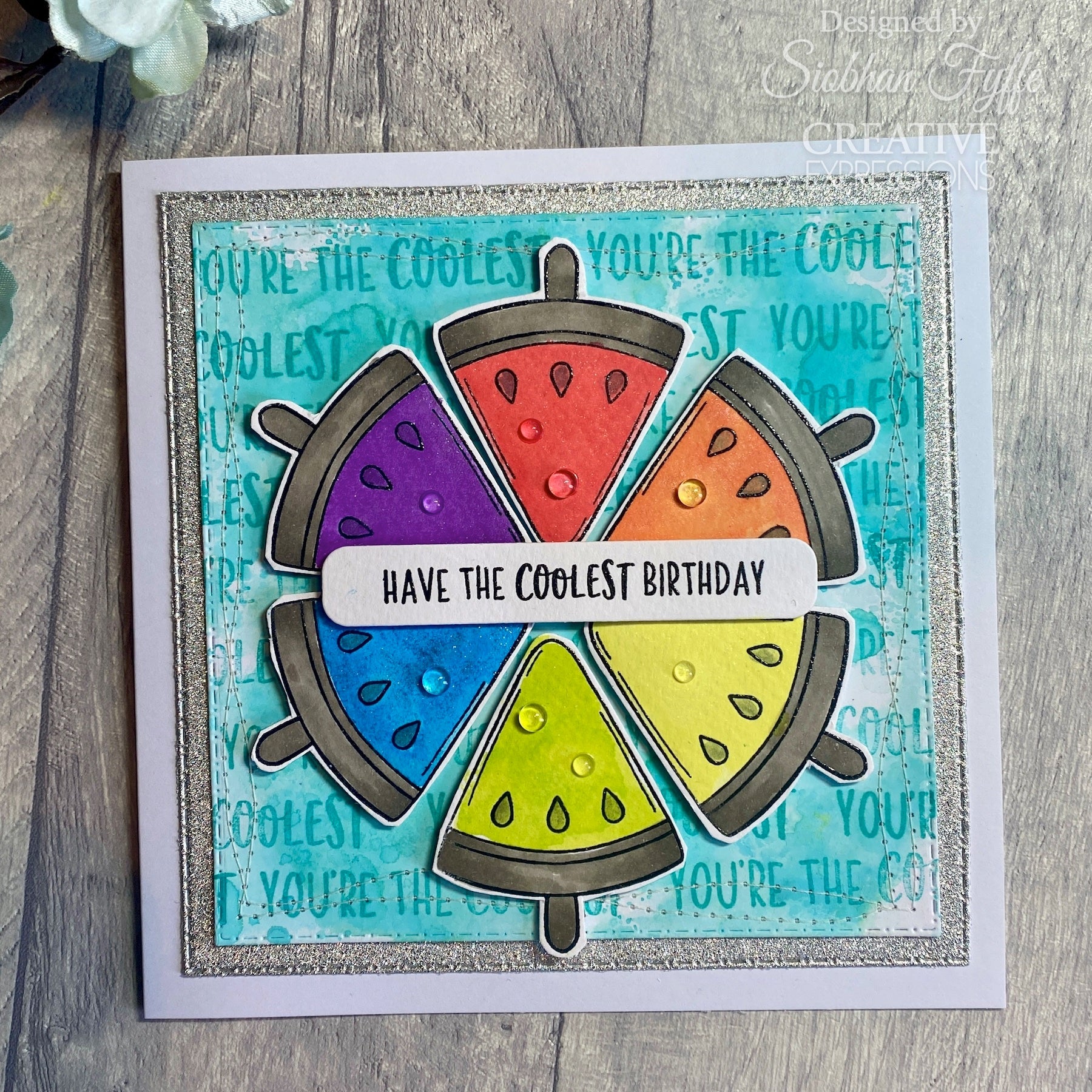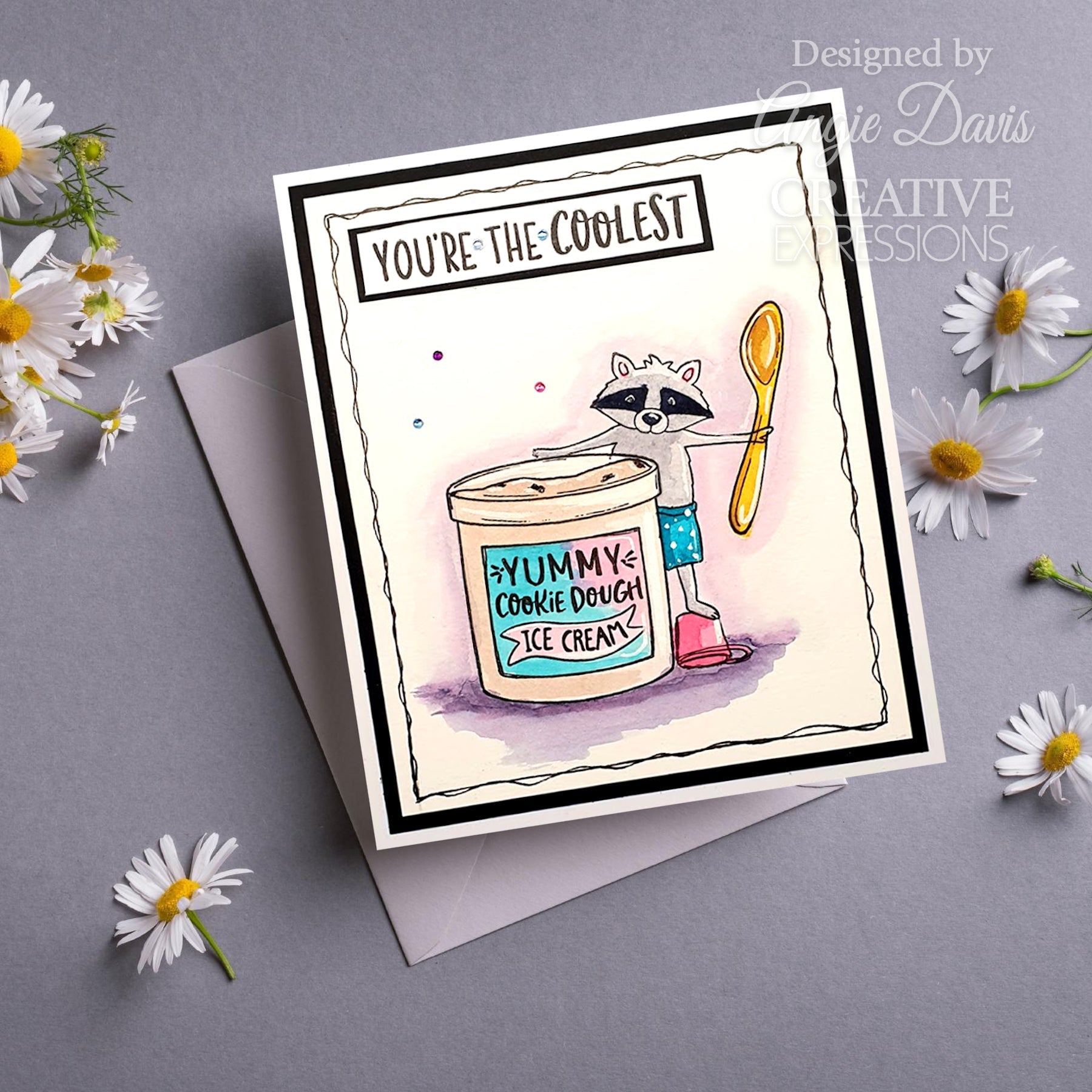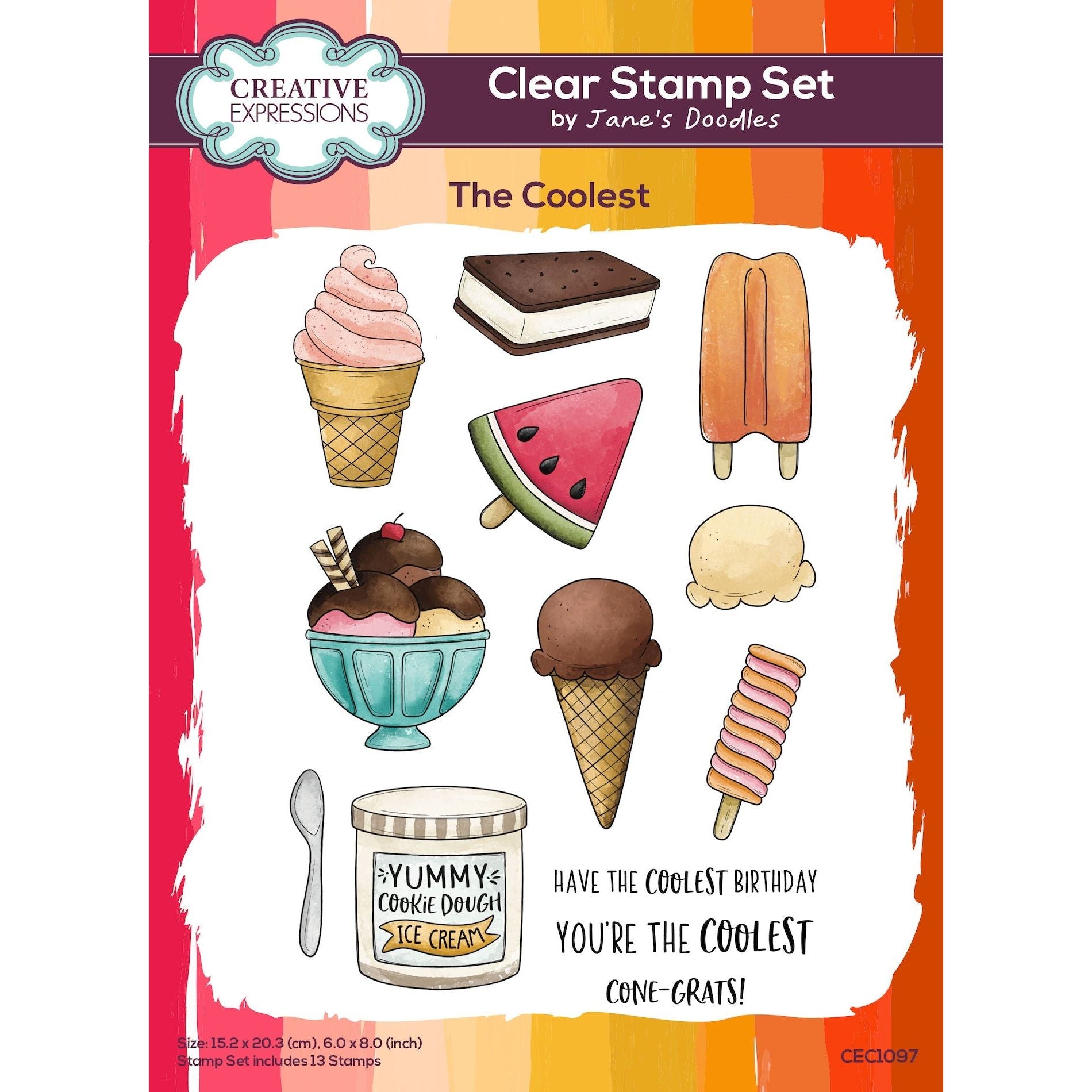 The Creative Expressions The Coolest clear stamp set, designed by Jane Beljo of Jane's Doodles, captures her signature eclectic style, making crafting a delightful experience for both seasoned artisans and beginners alike. This high-quality clear photopolymer stamp set measures 6 x 8 inches and features 13 charming stamps. Included are images of a soft-serve ice cream cone, a sundae, a one-scoop ice cream cone, additional scoops to customize, popsicles, a frozen watermelon slice, an ice cream sandwich, and a tub of Yummy Cookie Dough ice cream with a spoon. The set also includes heartwarming sentiments like "Have the coolest birthday," "You’re the coolest," and "Cone-grats."