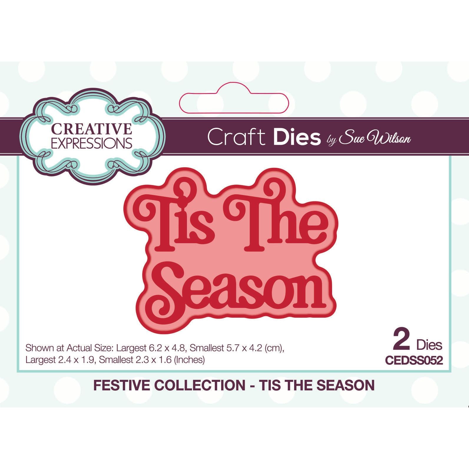 This Creative Expressions Tis The Season shadowed sentiments craft dies are part of Sue Wilson's Festive collection. These high-quality steel dies are compatible with most leading die-cutting machines and include 2 dies, with the largest die approximately 2.4 x 1.9 inches. The set features the words "Tis The Season" in a fun font, along with its shadow.