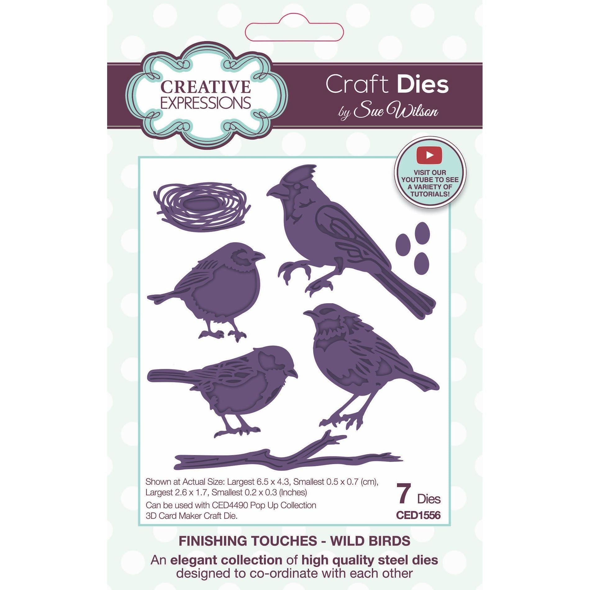 The Creative Expressions Wild Birds Dies, designed by Sue Wilson for the Finishing Touches Collection, are crafted to add a touch of nature-inspired beauty to your projects. Made from high-quality steel, these dies ensure clean and precise cuts and are compatible with most leading die-cutting machines. The set includes seven dies, featuring a variety of elements such as a branch, a nest, eggs, and four different bird designs. The largest die in the set measures approximately 2.6 x 1.7 inches, providing versatility for a range of crafting projects.