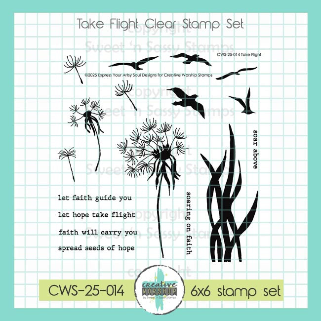 Experience the elegance and exclusivity of Creative Worship Take Flight Clear Stamps. This 6x6 inch stamp set captures birds in flight, accompanied by dandelions and grass, perfect for adding a touch of sophistication to your projects.Sentiments include: