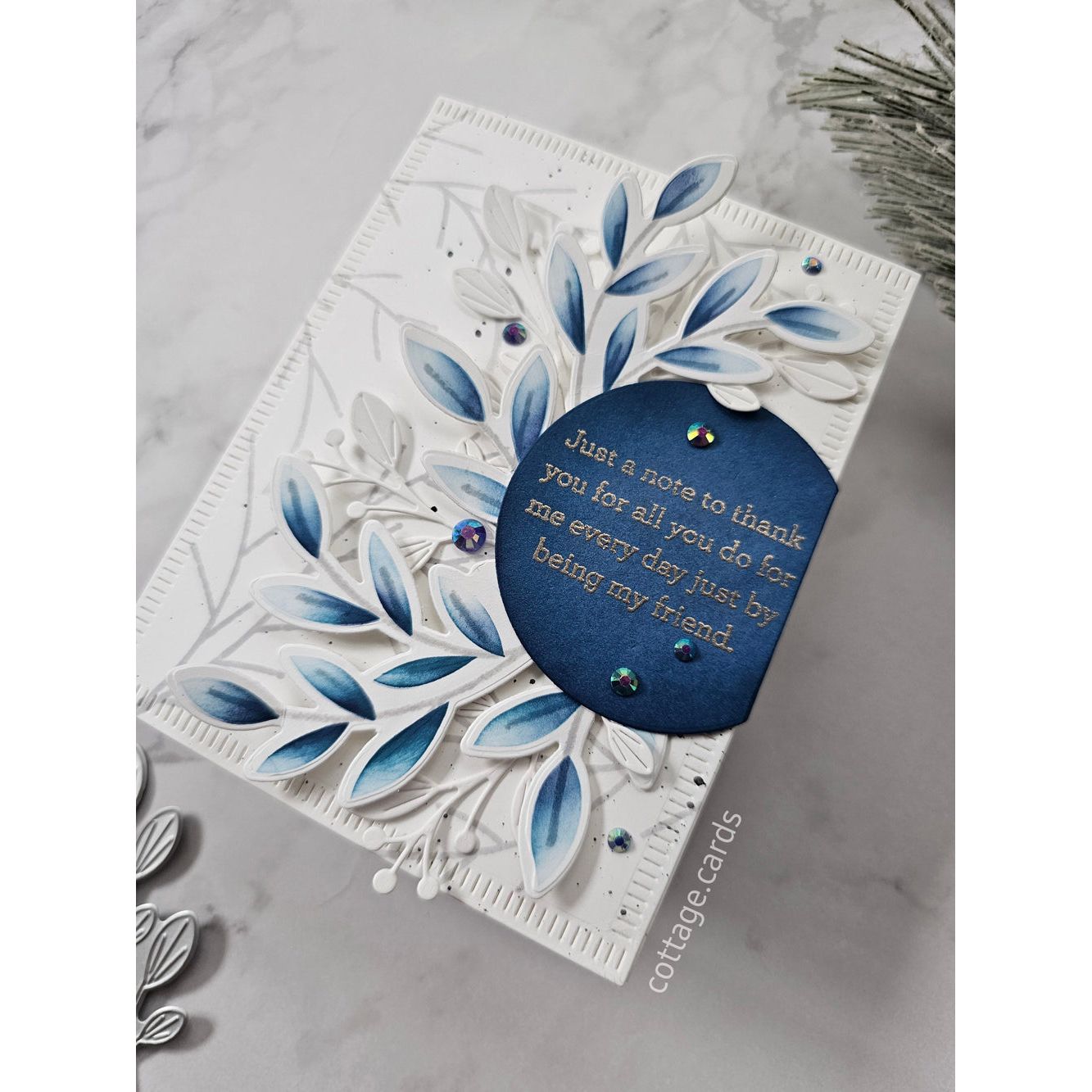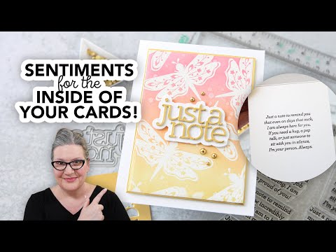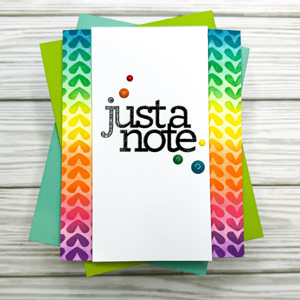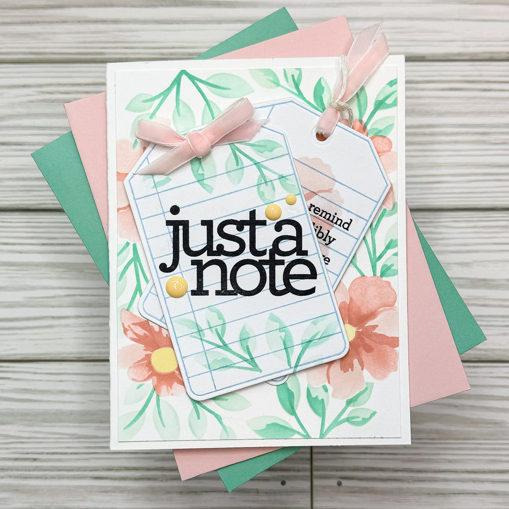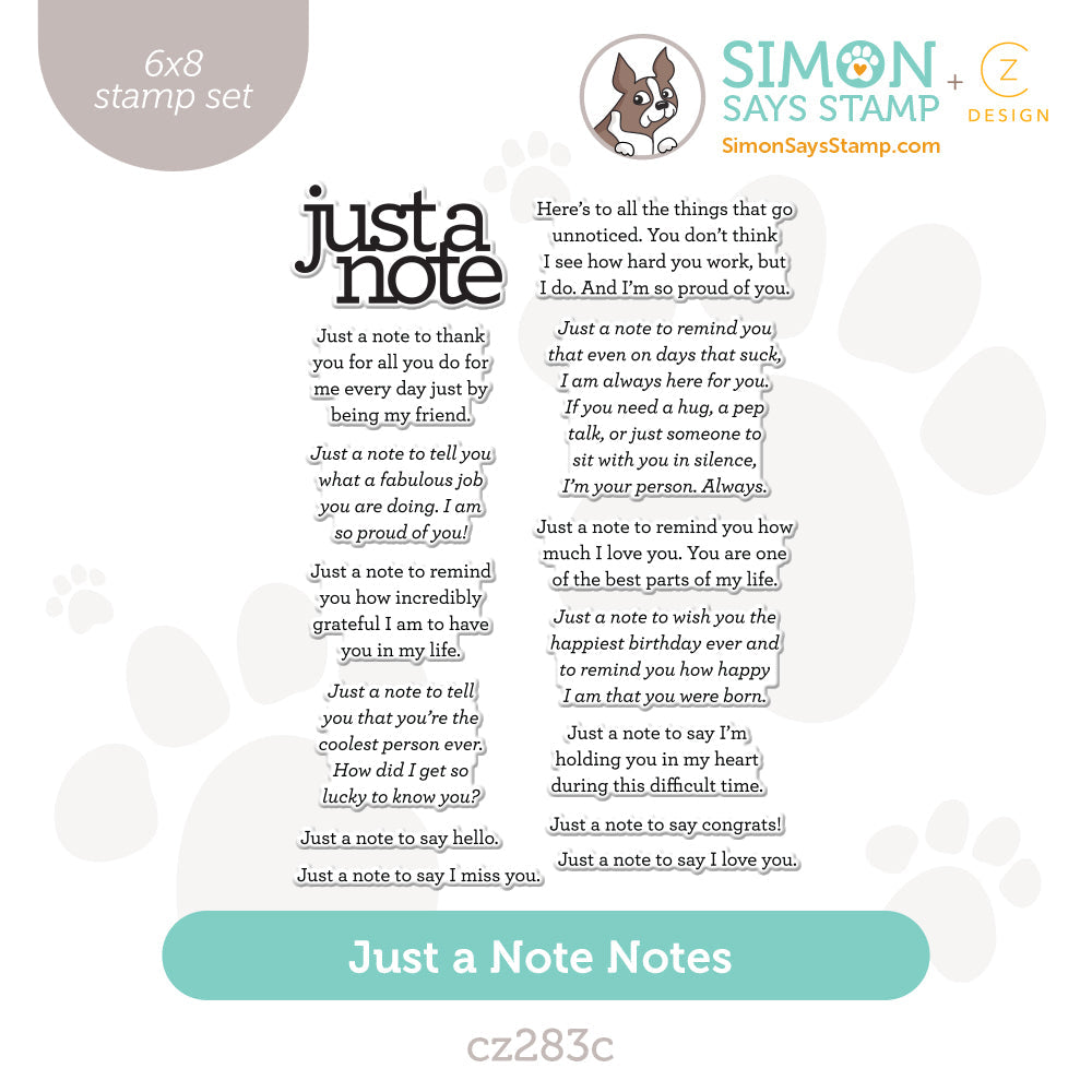 This versatile sentiment set features a large "just a note" sentiment along with various smaller sentiments that can be used both inside and outside of cards.