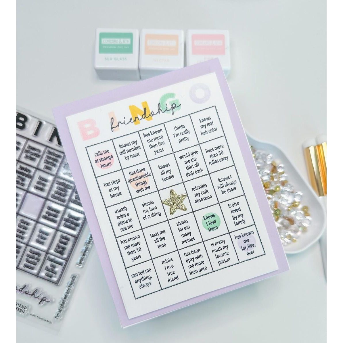 Elevate your cardmaking with this fun and unique set. It includes a bingo card adorned with descriptors celebrating friendship, such as: