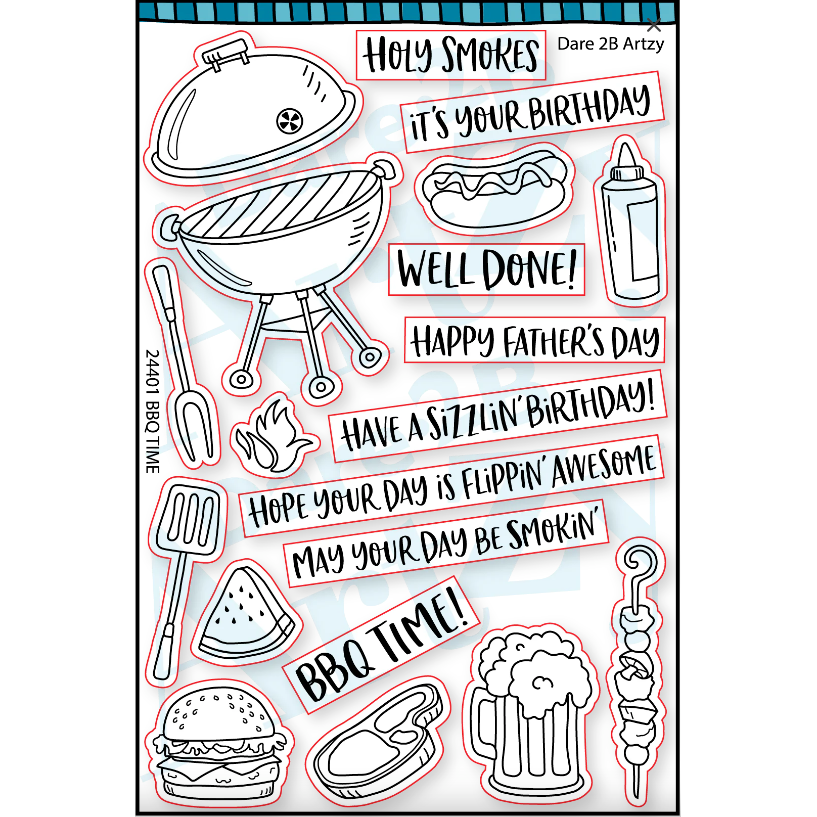 Introducing the Dare 2B Artzy BBQ Time Clear Stamp Set, where every creation sizzles with flavor and fun! Dive into the world of outdoor grilling with this collection, featuring all the BBQ essentials and tools, perfect for card making and scrapbooking. Whether it's Father's Day festivities or a casual summer gathering, these stamps capture the spirit of backyard barbecues with savory delights and handy utensils. Let your creativity grill and chill as you craft cards or preserve memories of sunny days and tasty treats. This 4 x 6-inch set also includes a variety of fun sentiments including,