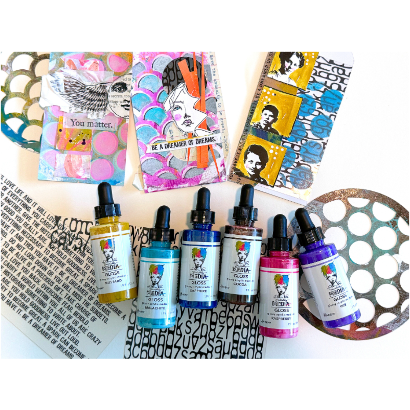 The Dina Wakley Ranger Mustard Media Gloss Dropper is a water-soluble acrylic liquid with a dropper applicator that dries to a glossy finish. Perfect for paper, fabric, and porous surfaces including Media Journals, Chipboard Shapes, and Media Board. Use the dropper or brush for application, ensuring to shake well to mix the pigments. Comes in a 1.9 fl. oz. bottle and remains permanent once dry.