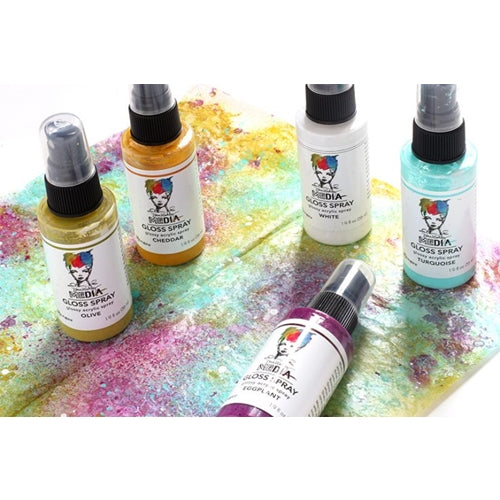 Dina Wakley Media Gloss Spray is an opaque acrylic spray that dries to a glossy finish. Spray into Media Journals, onto Chipboard Shapes, Media Board and other porous surfaces. Gloss Sprays are water-soluble when wet, permanent when dry. All Dina Wakley Media Gloss Spray colors are available in a 1.9 fl. oz. spray bottle.
