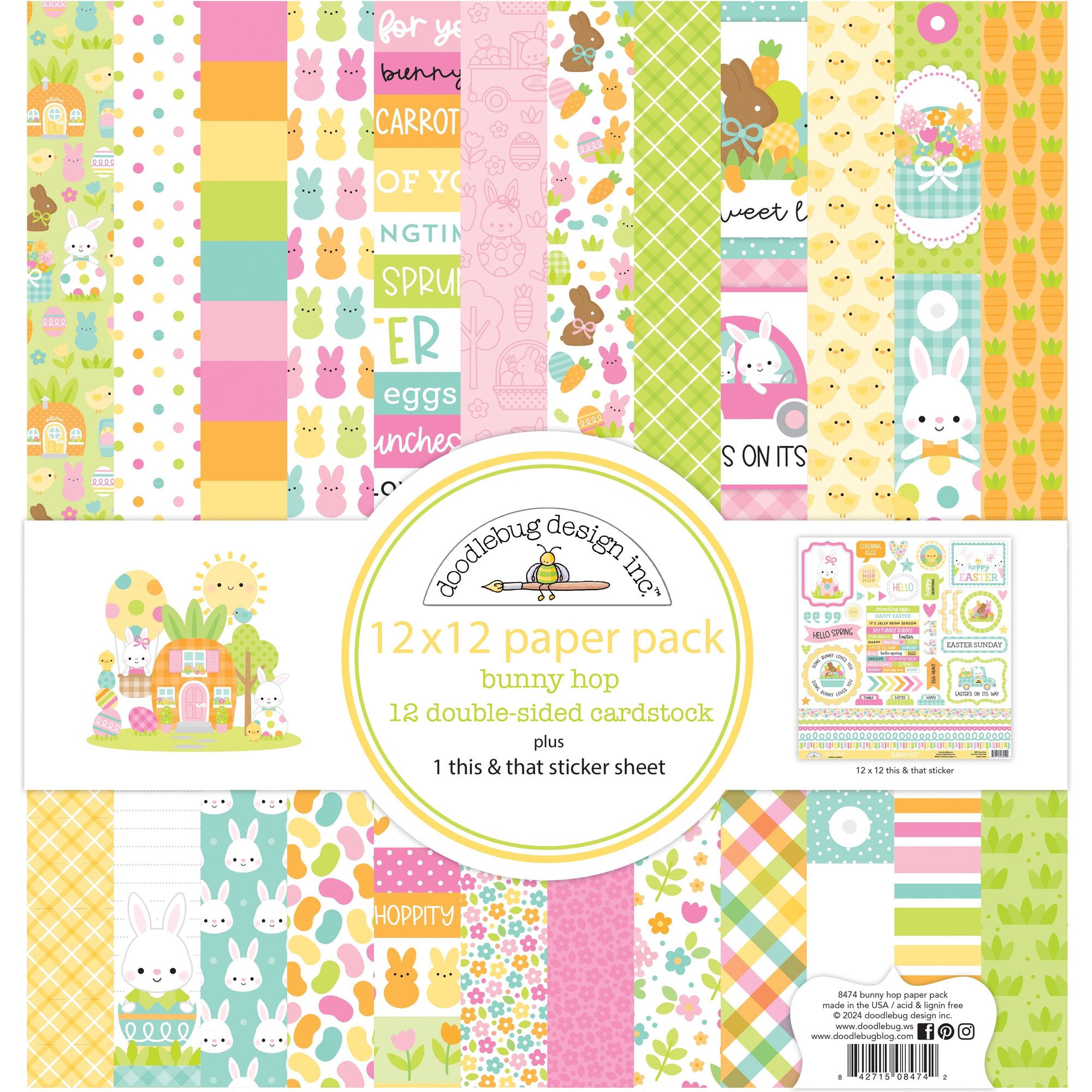 Get ready for sunny days with the Doodlebug Bunny Hop 12x12 Inch Paper Pack! Featuring cheerful spring colors and adorable Easter designs like bunnies, chicks, and carrot homes, this paper pad is sure to make you smile. With pastel plaid, polka dots, and playful prints, you'll love creating fun and whimsical projects with this pack. Hop to it and add it to your collection today! In addition to 12 sheets of double-sided 12x12 inch cardstock, you will also receive one 12x12 inch sheet of the coordinating 'this and that' sticker sheet!